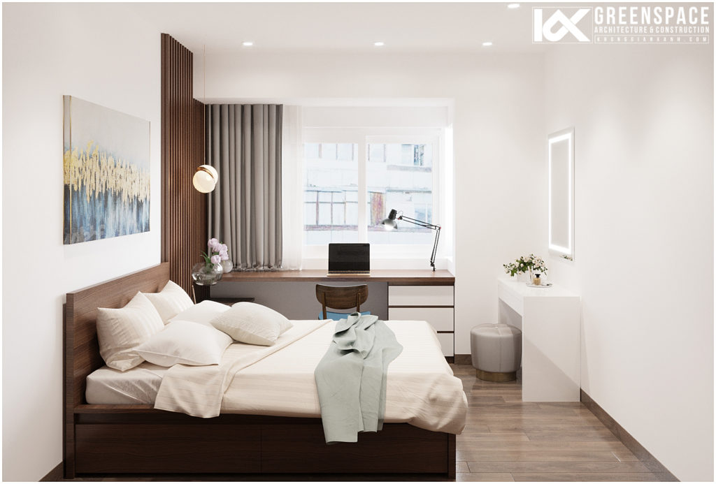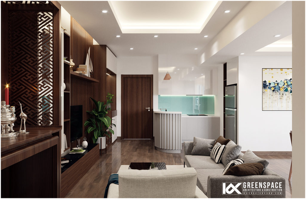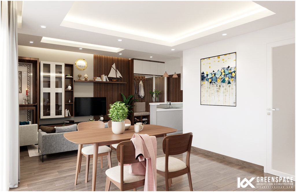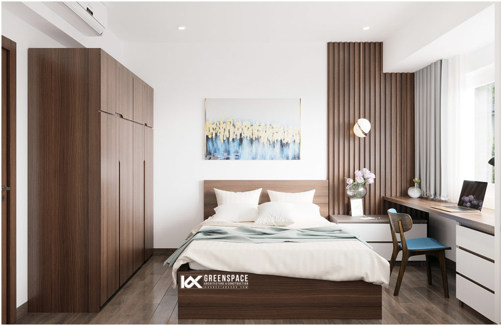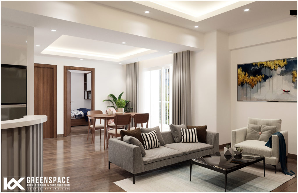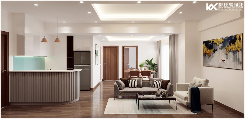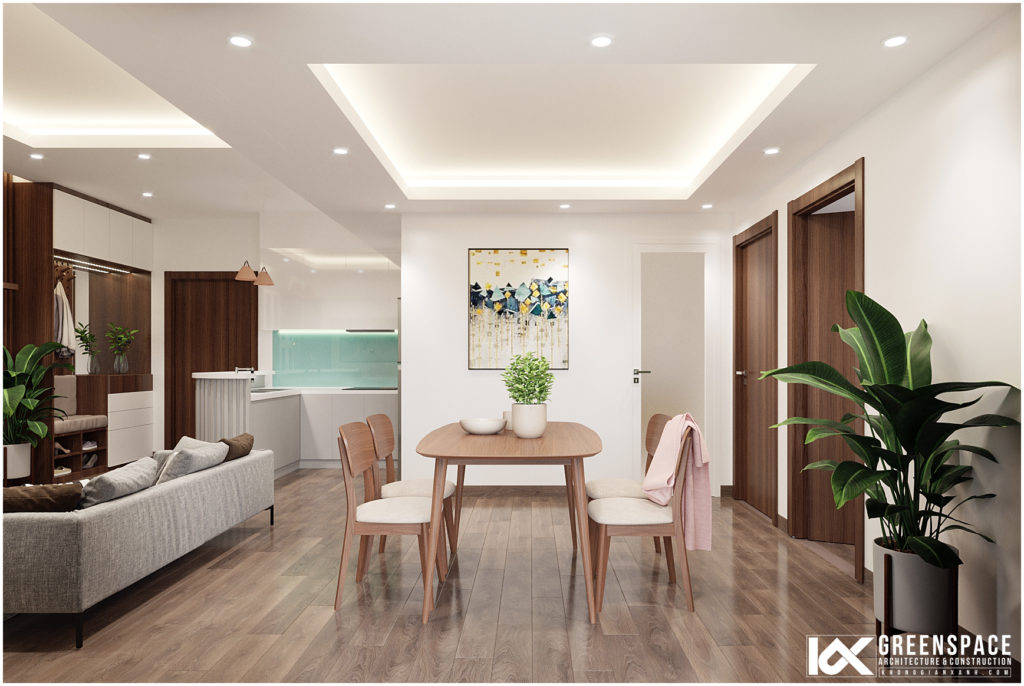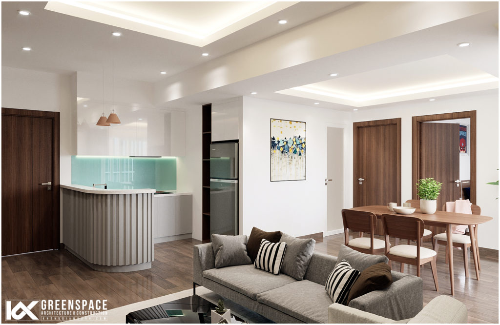 Công trình sử dụng gỗ công nghiệp làm chất liệu chủ đạo cho đồ nội thất bởi tính linh hoạt và đa dụng của nó trong thiết kế. Sàn gỗ công nghiệp, trần thạch cao kết hợp với đồ nội thất được bài trí tinh tế gọn gàng mang lại một căn hộ đầy tiện nghi rộng rãi.