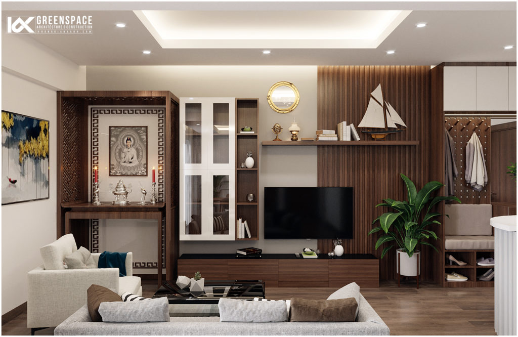 Tone màu gỗ nâu được dùng làm màu chính xuyên suốt, vách ti vi kết hợp hệ tủ giày và tủ thờ tạo nên một diện tủ liên hoàn kết nối chặt chẽ về hình thức nhưng công năng vẫn tách biệt theo đúng mục đích sử dụng.