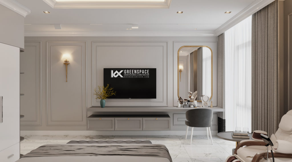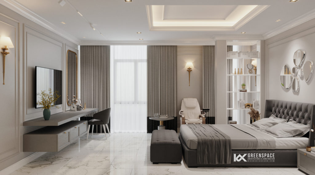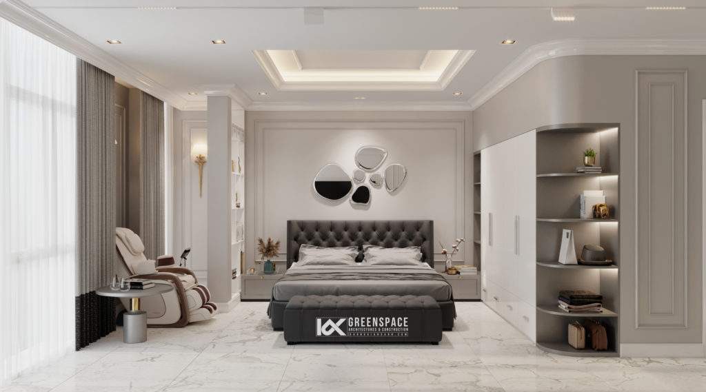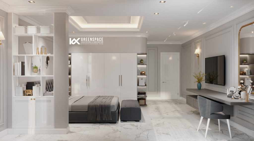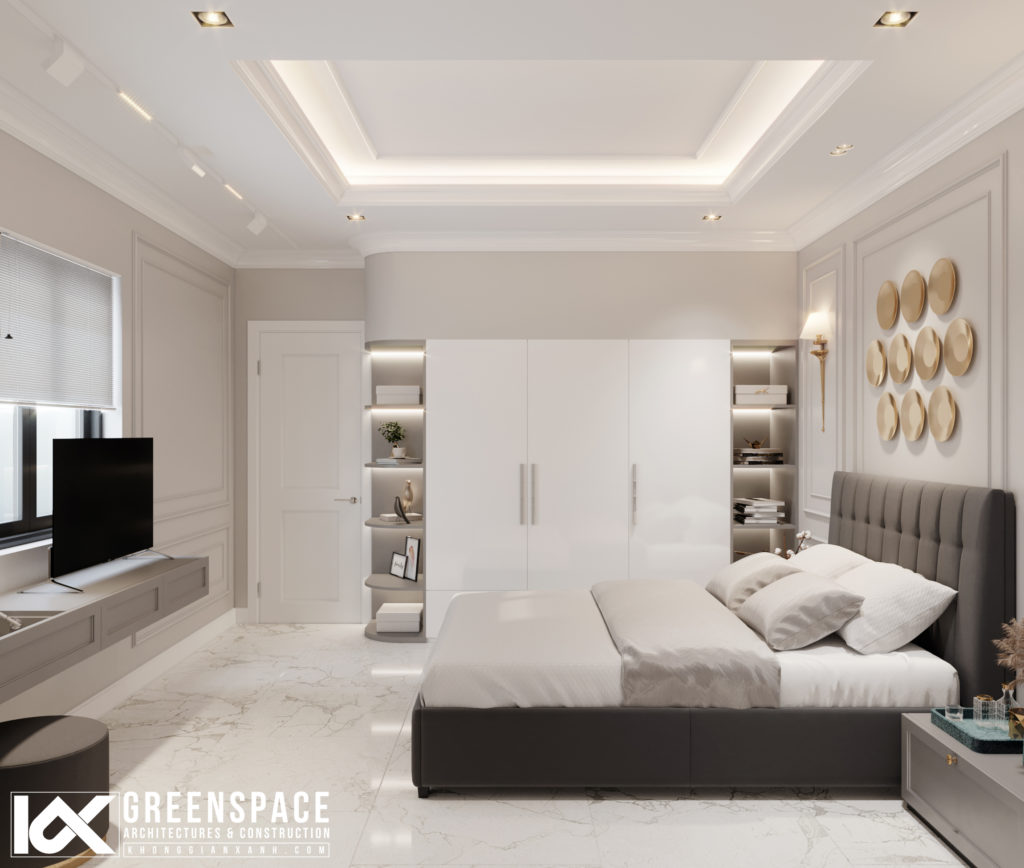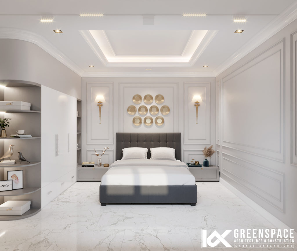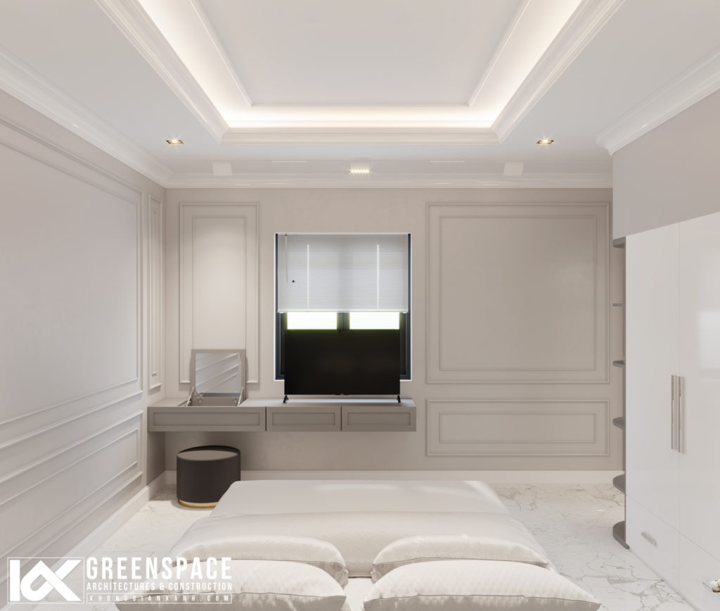 Lựa chọn gam màu lạnh với phong cách tân cổ điển nhưng lại toát lên một vẻ đẹp nhẹ nhàng hiện đại, không bị nặng nề hoa văn phào chỉ… Dự án đã thực sự thành công trong việc phối hợp các mảng màu, tạo độ chuyển các vật liệu .. khiến tổng thể không gian là một bố cục chặt chẽ, hài hòa nhẹ nhàng …