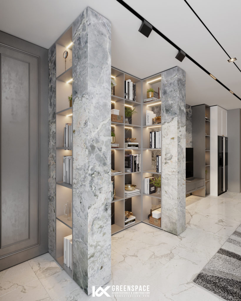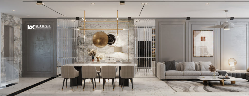 Các chi tiết phào chỉ được nhấn nhá tự nhiên và sử dụng 1 cách tiết chế, mảng tường được hòa trộn cùng các chất liệu khác như đá – kính tạo ra những khoảng đặc rộng, tương phản về chất liệu tôn nên nét sang trọng tinh tế cho không gian..