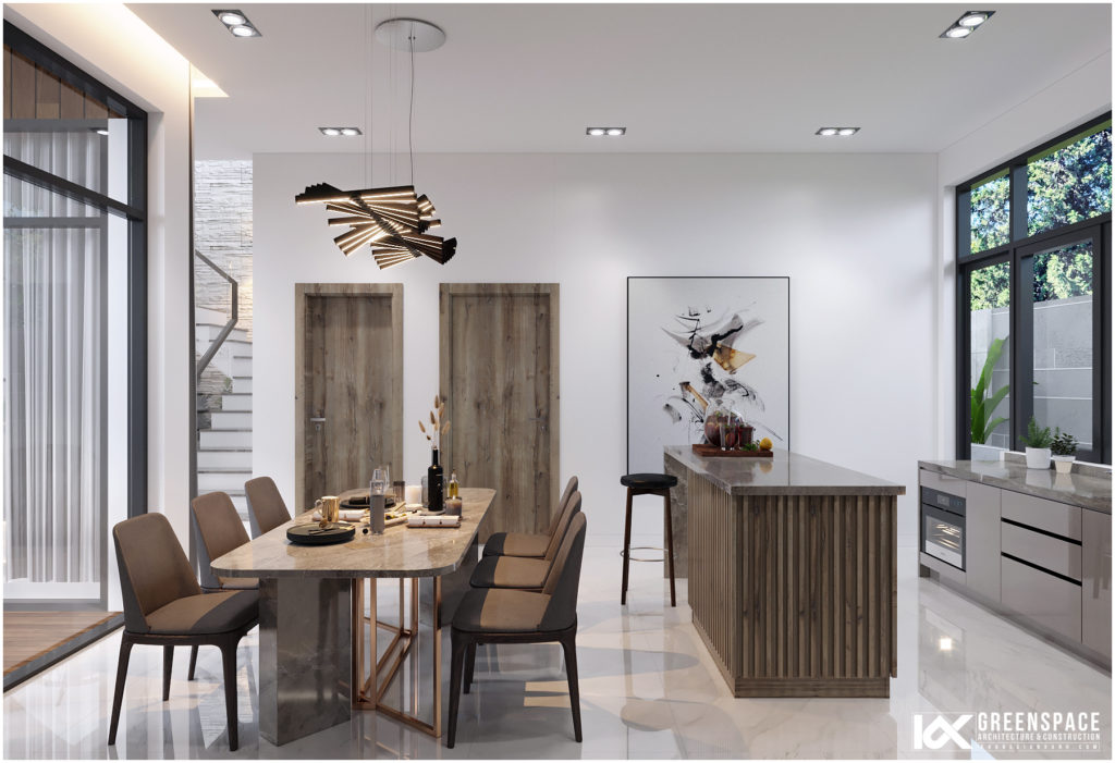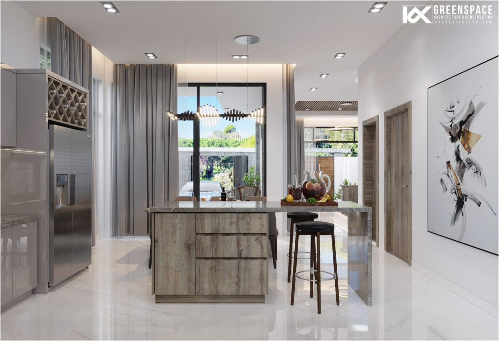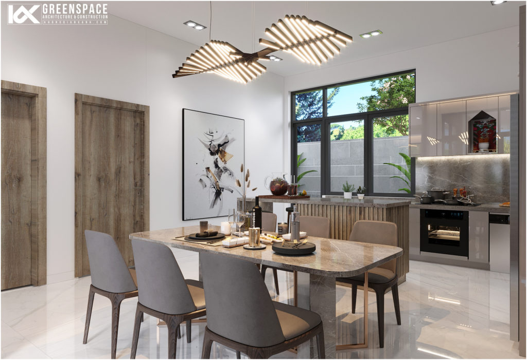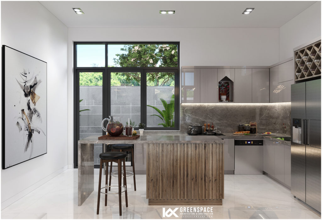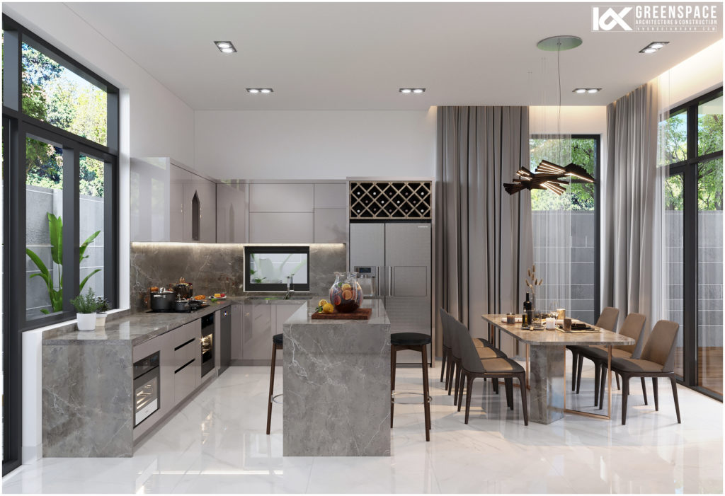 Khu bếp ăn đầy đủ chức năng với tone xám sang trọng, gam xám đến từ các chất liệu đá – gỗ – rèm vải tạo nên sự liên kết chặt chẽ trong không gian, toát lên vẻ đẹp đồng nhất hài hòa…