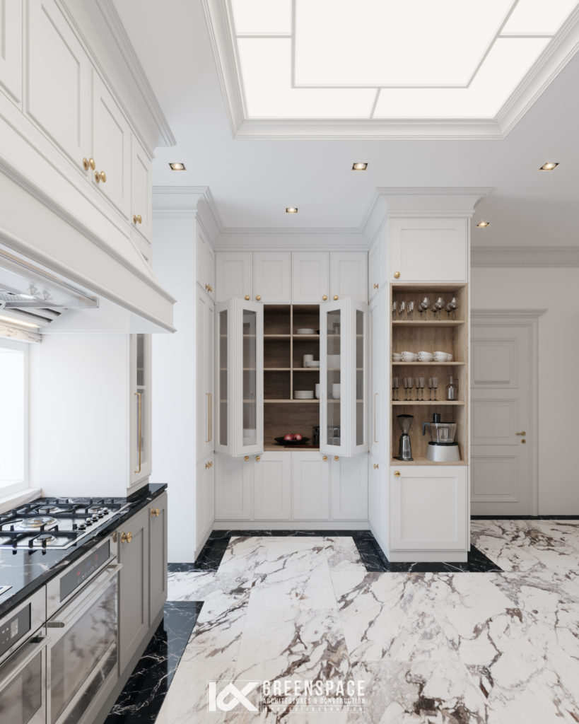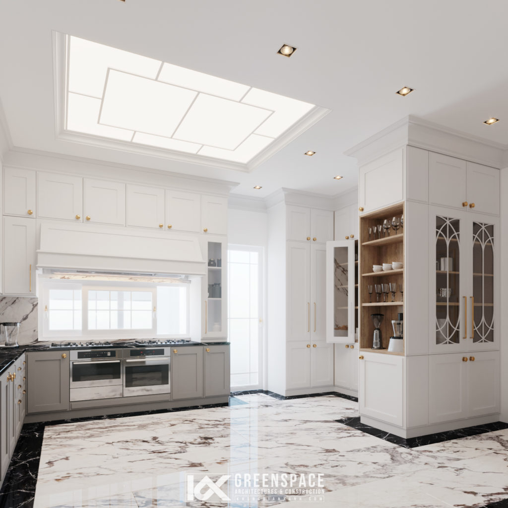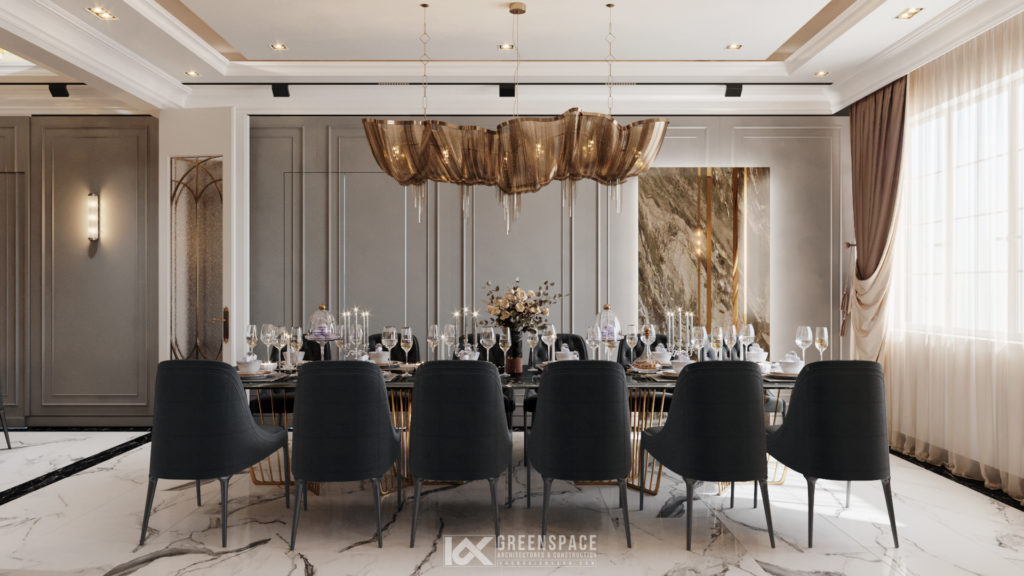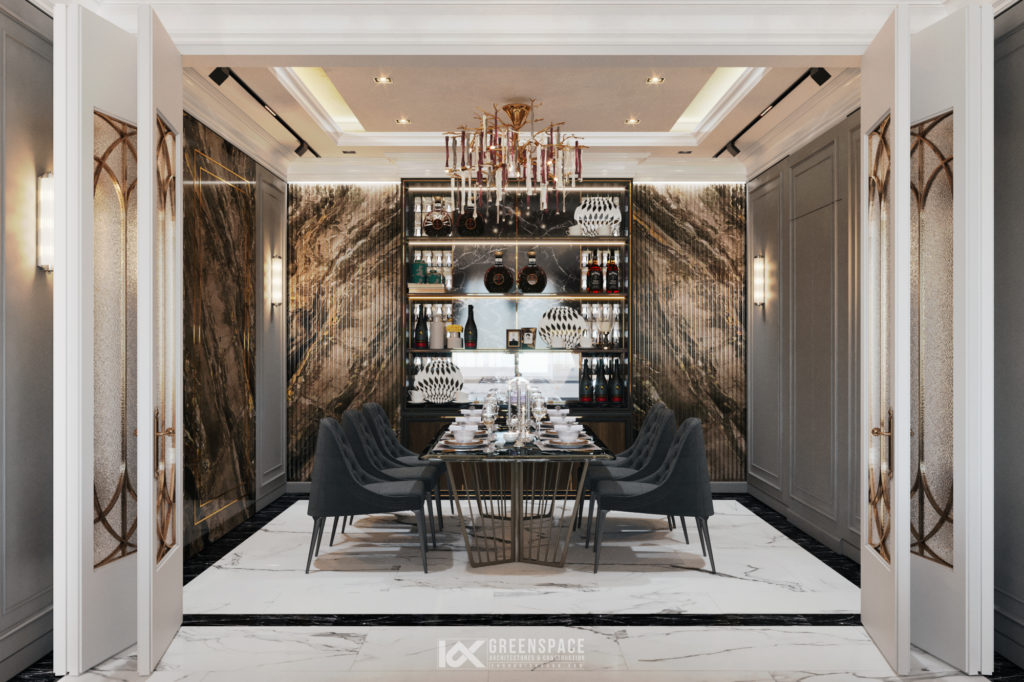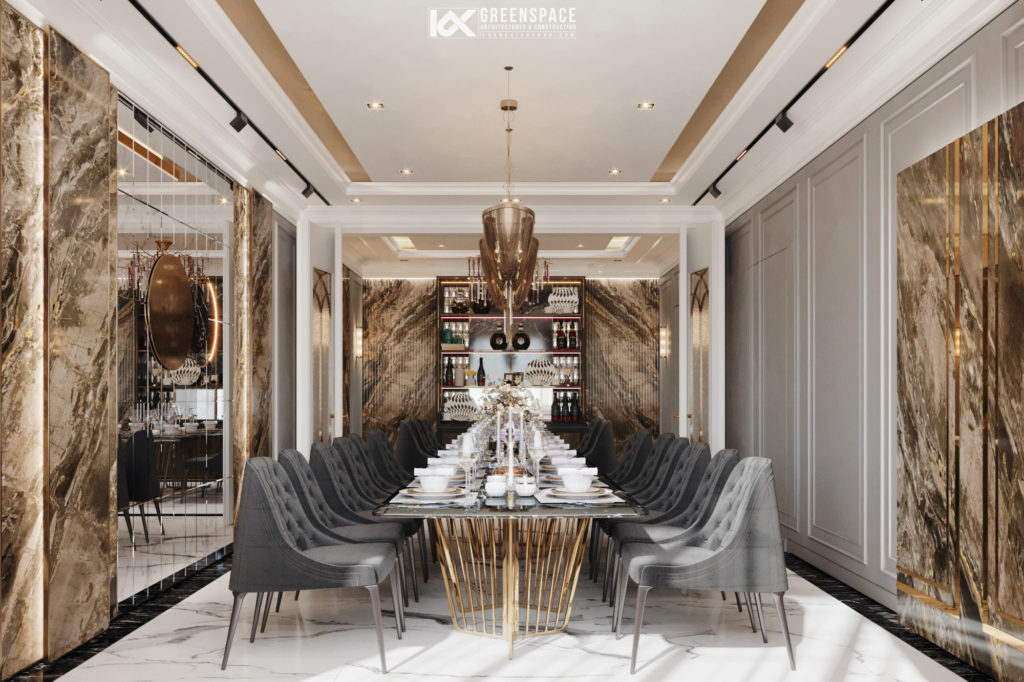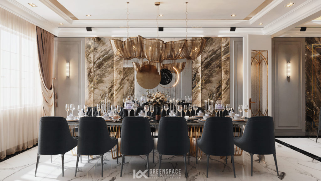 Một thiết kế đẳng cấp theo phong cách tân cổ điển nhưng được biến tấu tiết chế 1 chút phào chỉ để tôn lên nét sang trọng hiện đại cho công trình, không gian phòng ăn nổi bật với những mảng tường nhấn họa tiết đá tự nhiên kết hợp gương và chất liệu inox mạ đồng tạo nên một tổng thể hài hòa giữa nét đẹp tân cổ và hiện đại…