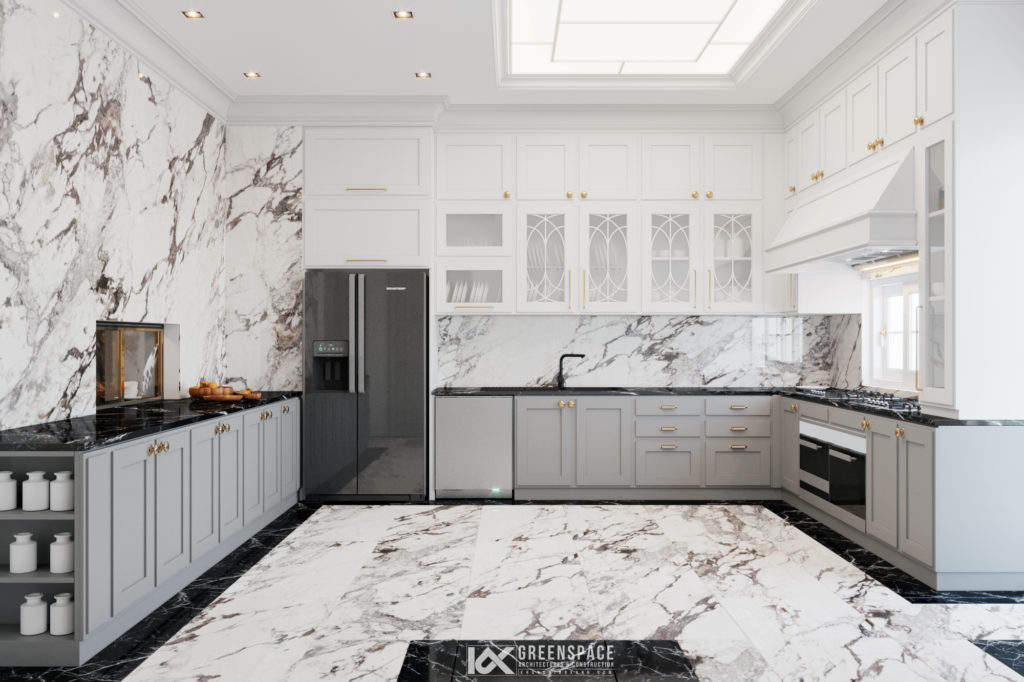 Khu bếp đầy đủ chức năng tràn ngập ánh sáng với tone màu ghi – trắng, họa tiết vân đá khổ lớn được kết hợp một cách tinh tế khiến không gian toát lên vẻ sang trọng nhẹ nhàng..