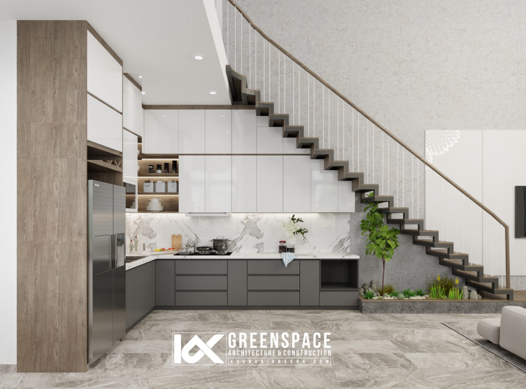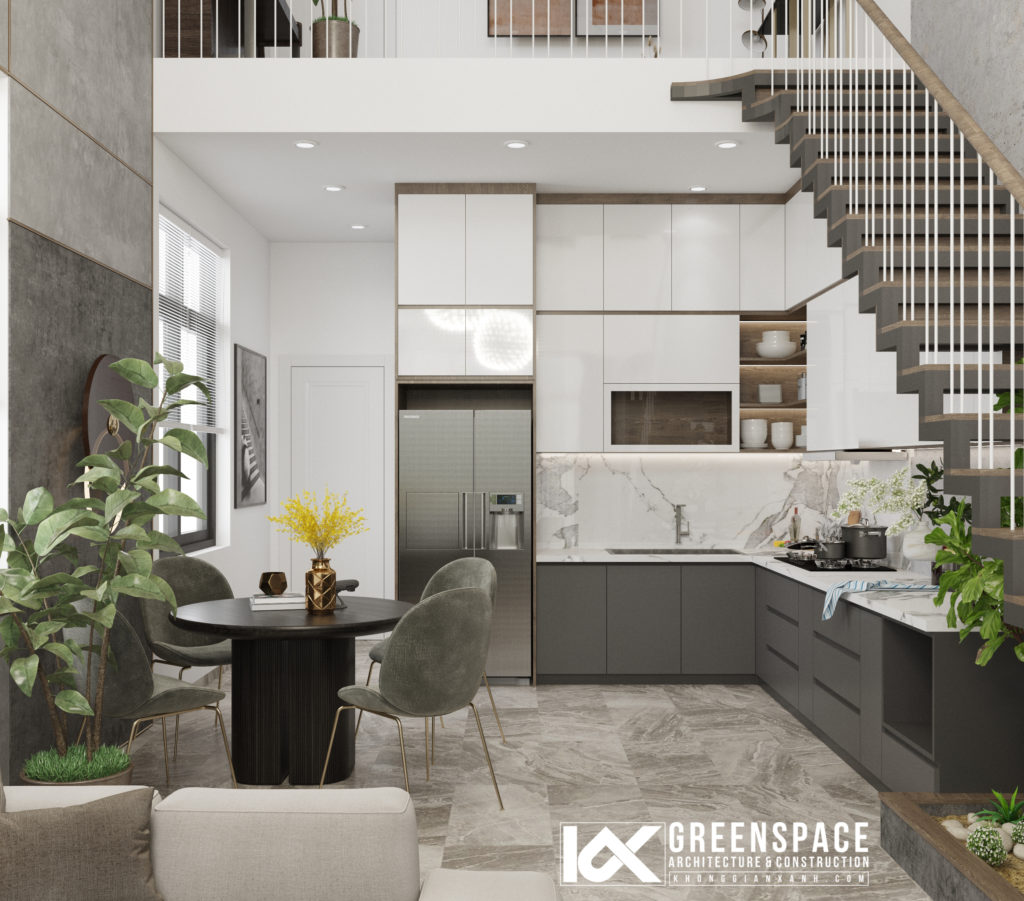 Khu bếp đơn giản đầy đủ chức năng với 1 phần tủ ăn vào gầm thang, sự kết hợp giữa tone ghi đậm và trắng tạo nên sự tương phản nổi bật…