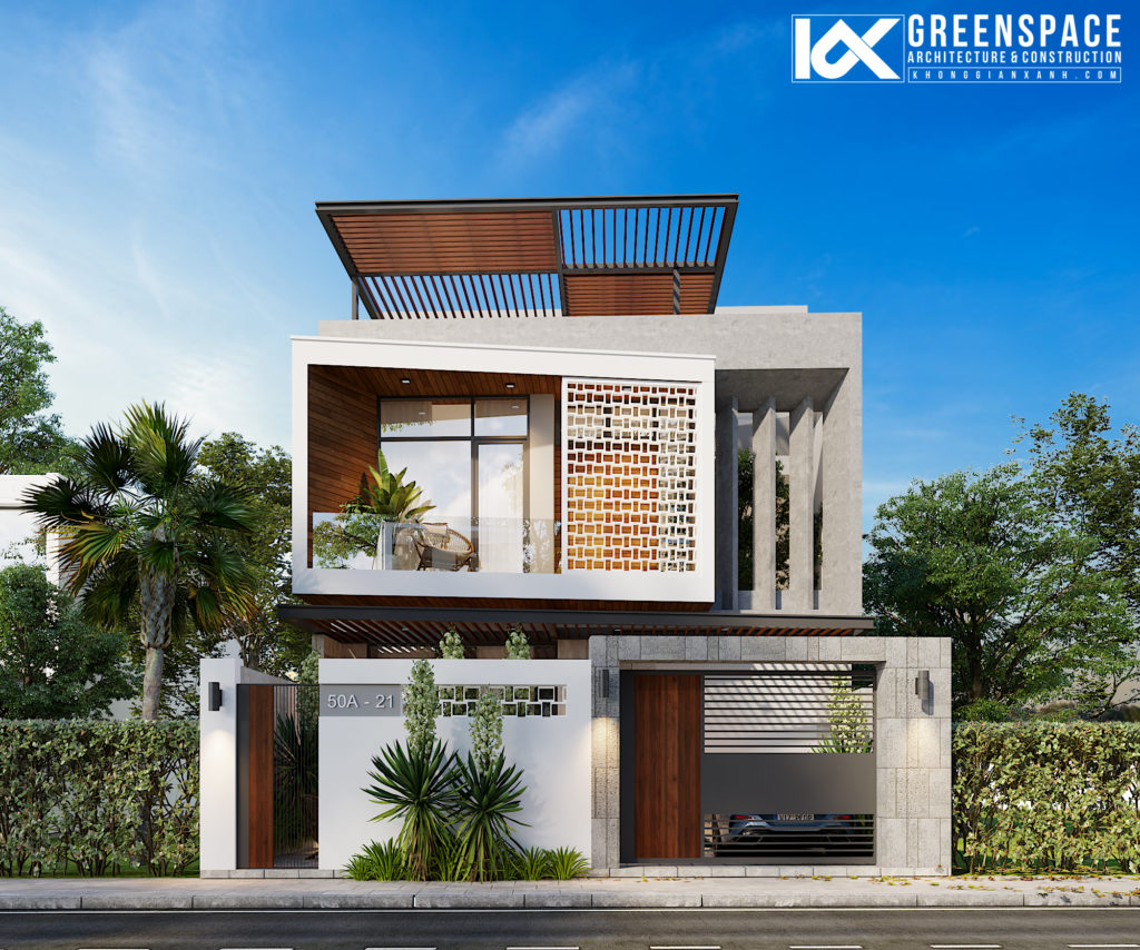 Mặt tiền sử dụng hình khối đơn giản, tone màu xám – trắng trung tính kết hợp màu gỗ ấm làm điểm nhấn. Sử dụng gạch thông gió như một yếu tố trang trí kết hợp tạo nên những mảng rỗng an toàn cho không gian…