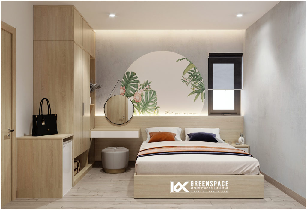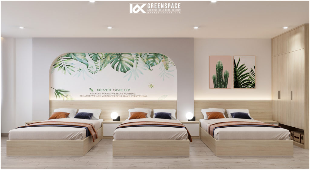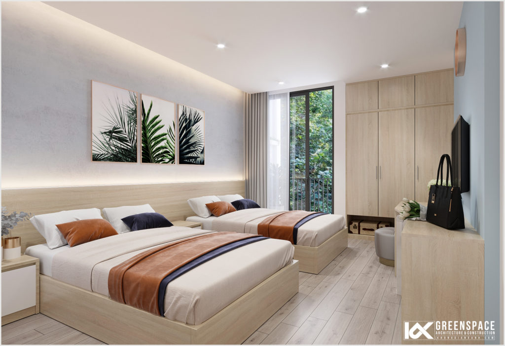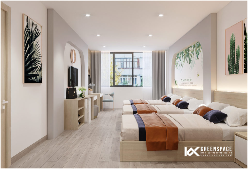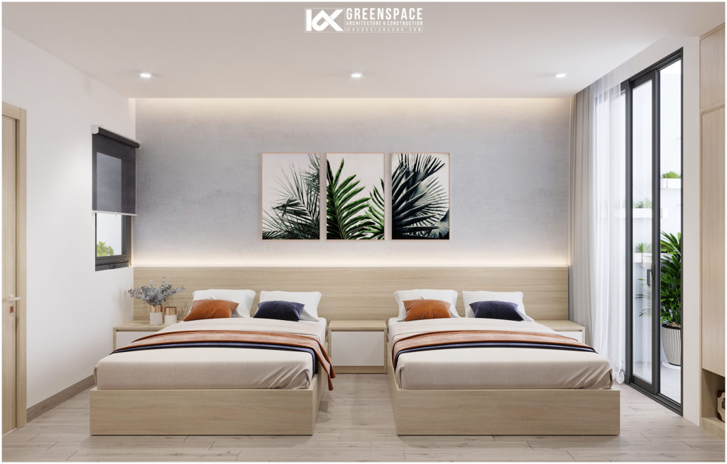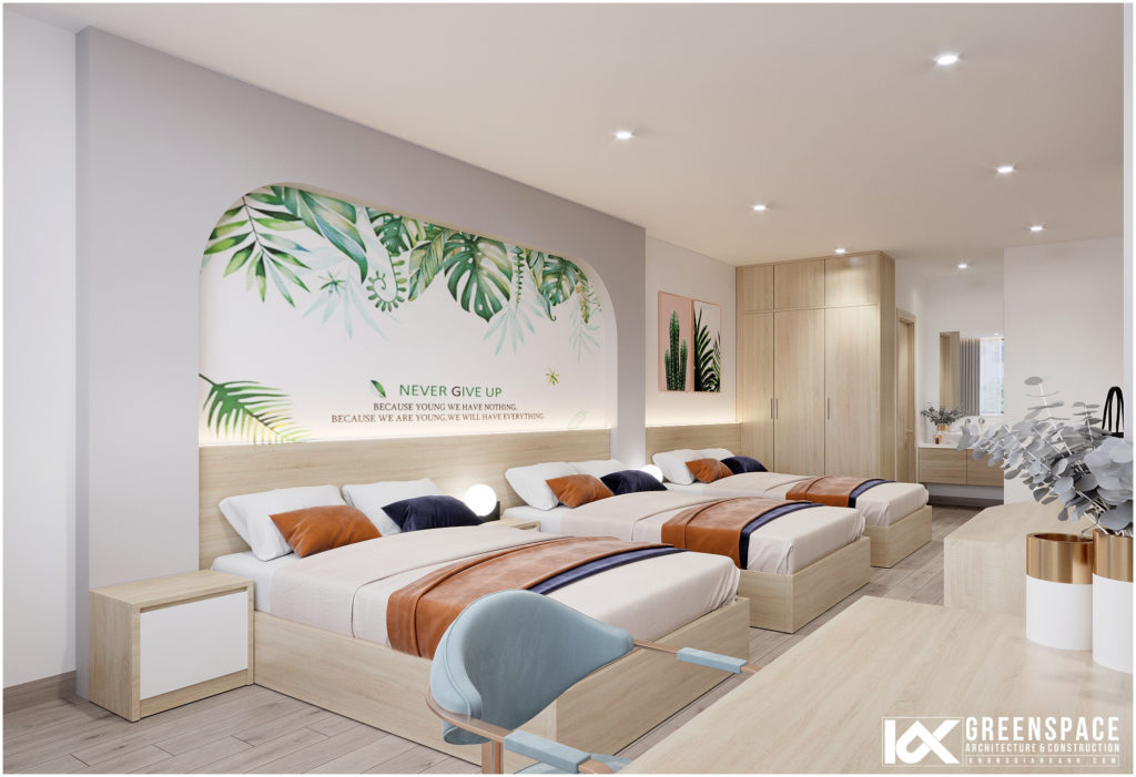Thiết kế phòng lớn phù hợp cho nhóm bạn hay gia đình đi du lịch, sử dụng gam màu sáng nhã nhặn tạo cảm giác rộng rãi. Vách nhấn đầu giường được mix họa tiết tropical cùng đồ nội thất tối giản hiện đại mang đến nét tinh tế nhẹ nhàng cho không gian.
