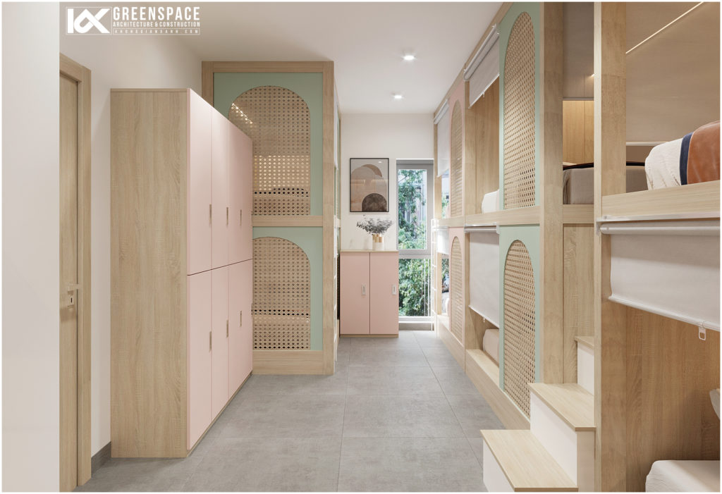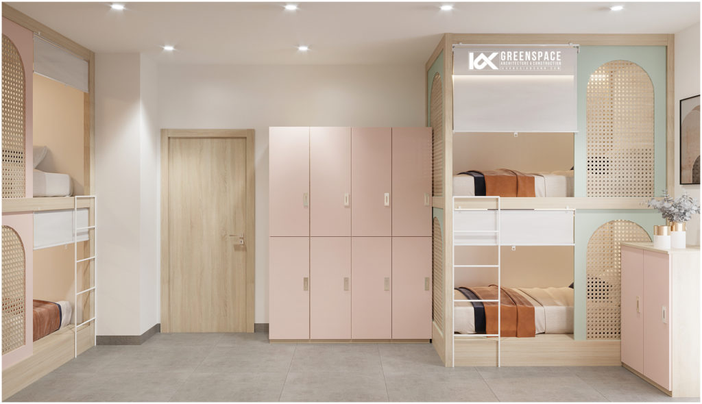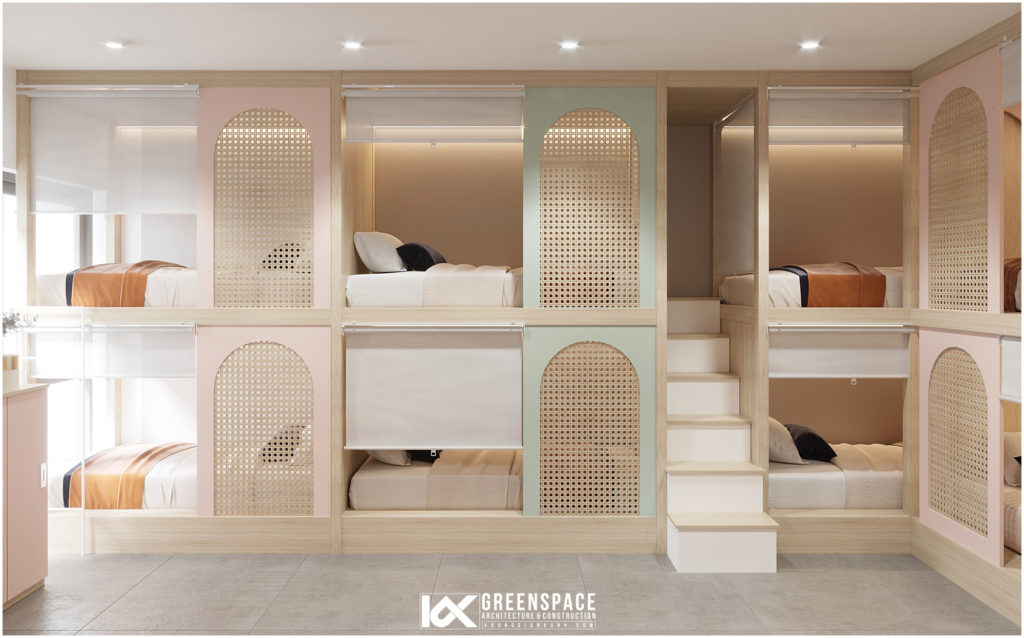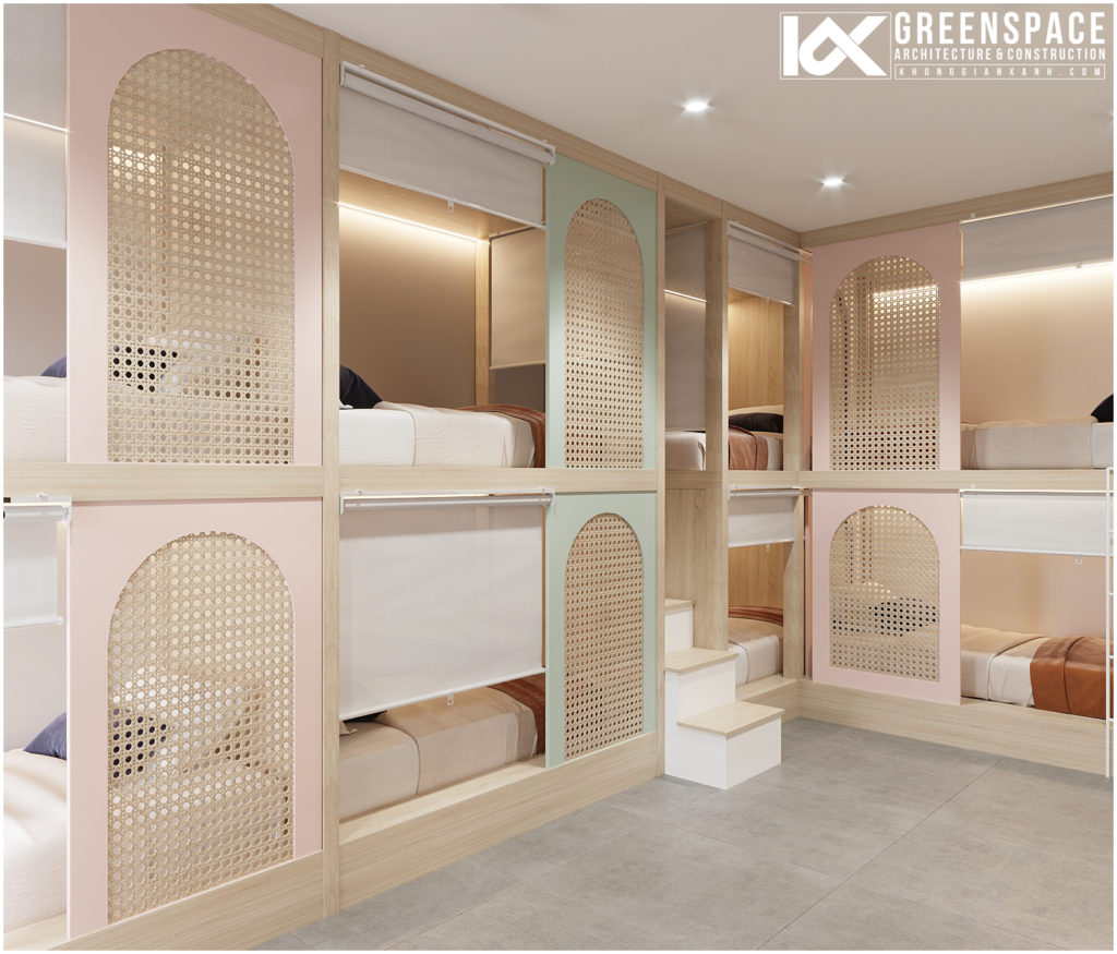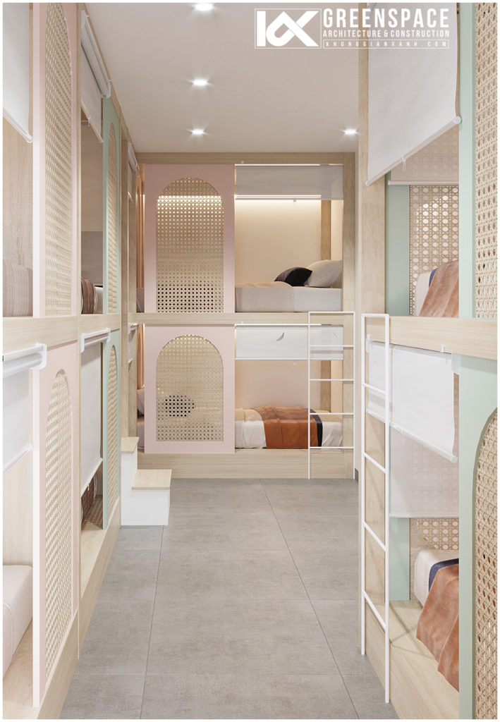 Phòng Dorm được thiết kế dành cho nhóm khách hàng trẻ trung cá tính với nhiều giường tầng có sự ngăn nhẹ để tạo khoảng riêng tư tuy nhiên không quá cách biệt để giữ lại đúng tính chất của phòng. Sử dụng tone màu pastel nhẹ nhàng để mang lại cảm giác gọn gàng rộng rãi.