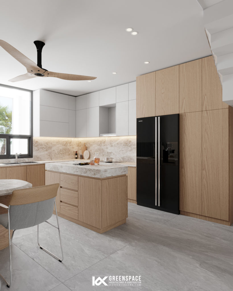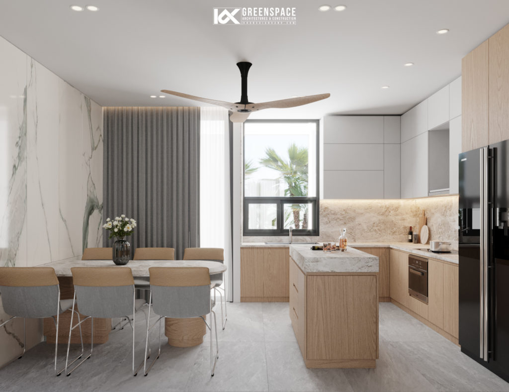 Khu bếp ăn gọn gàng tối giản với đầy đủ tiện nghi, sử dụng gam màu nhẹ nhàng kết hợp với tone gỗ sáng mang đến một không gian trong trẻo ấm áp.