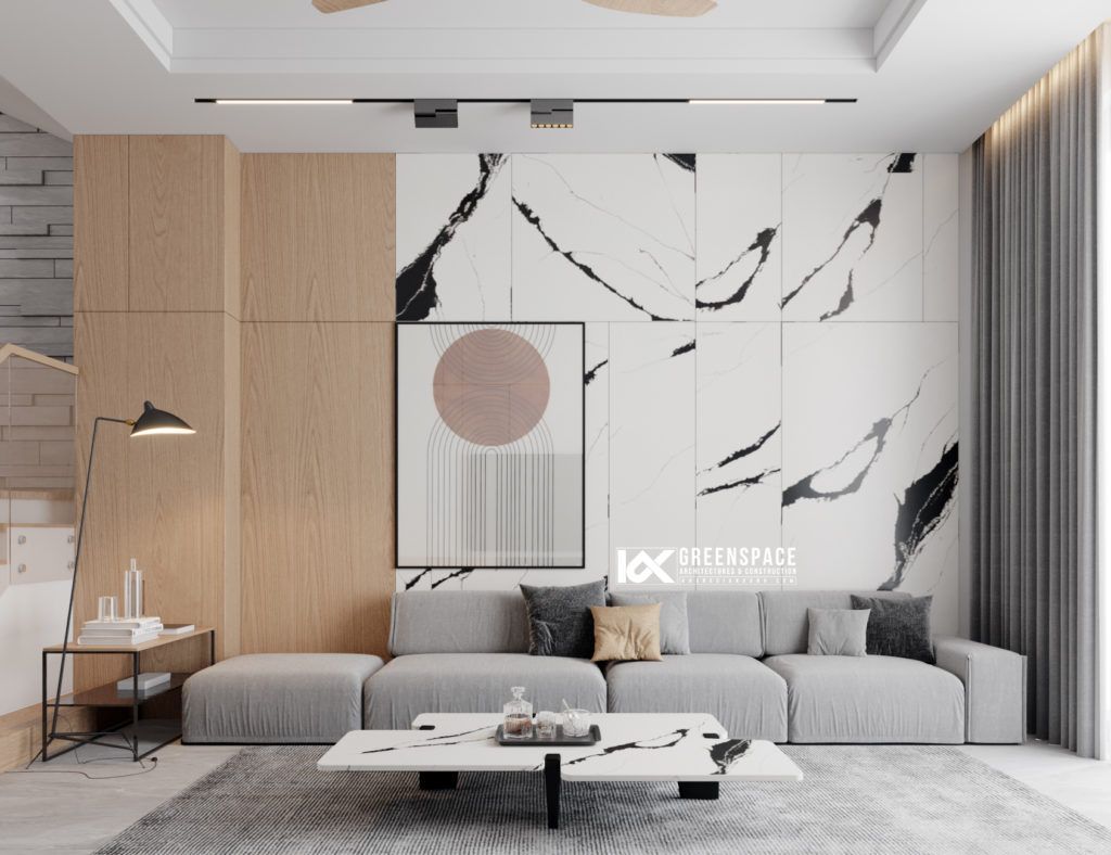 Vách ốp trang trí sau sofa trở thành điểm nhấn không gian chính của phòng khách, sự kết hợp giữa màu gỗ sáng và vân đá lơn tạo cảm giác hài hòa vừa vặn nhưng vẫn mang nét đẹp hiện đại tinh tế…