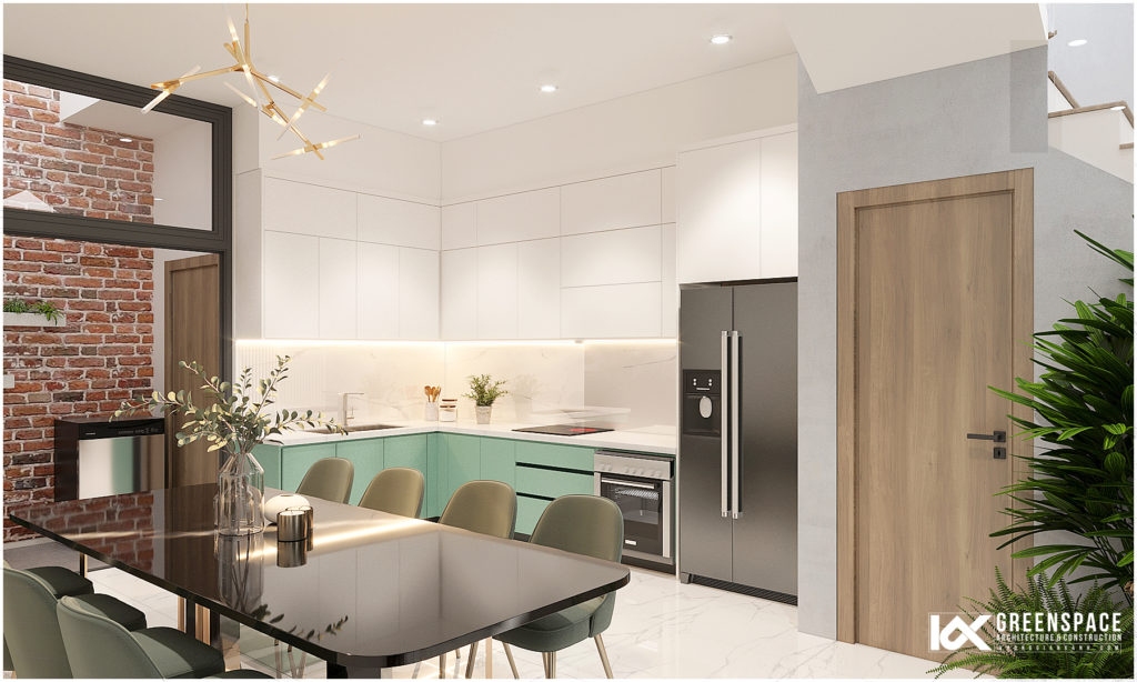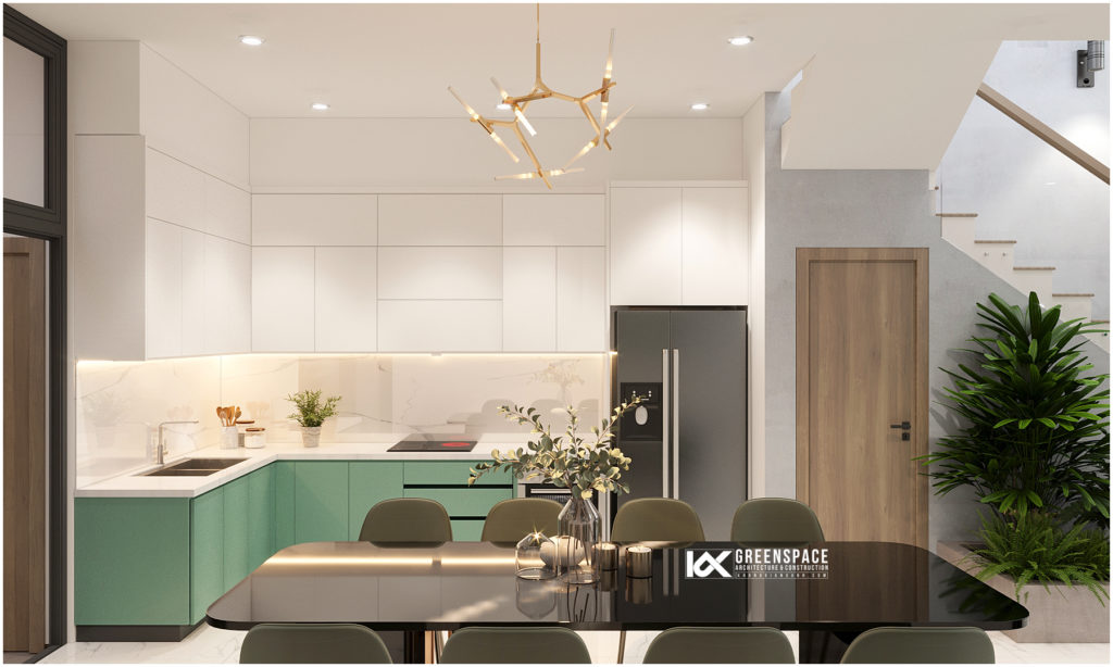 Khu bếp ăn được thiết kế đơn giản với đầy đủ chức năng, màu xanh lá kết hợp cùng gam trắng khiến hệ tủ bếp trở nên nổi bật cá tính hơn…