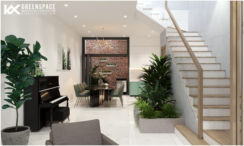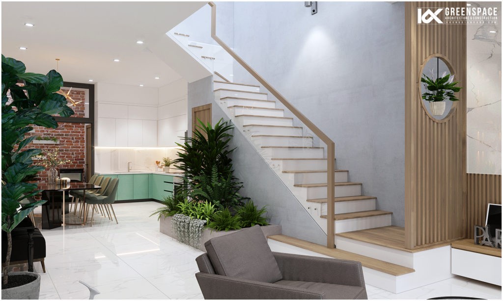 Không gian trong nhà được điểm một chút xanh bởi phần tiểu cảnh nhỏ nằm ngay cầu thang mang lại sức không tươi mát cho căn nhà…