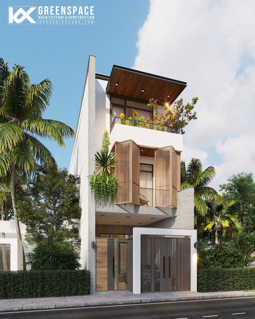 Để giải quyết vấn đề bất lợi về hướng nắng, mặt tiền được sử dụng hệ lam che linh hoạt đóng mở, cây xanh được đưa vào vừa đóng vai trò trang trí vừa tạo nên các khoảng đệm ngăn cách với không gian bên ngoài đường, tạo nên sự riêng tư cần thiết cho phòng ngủ chính.
