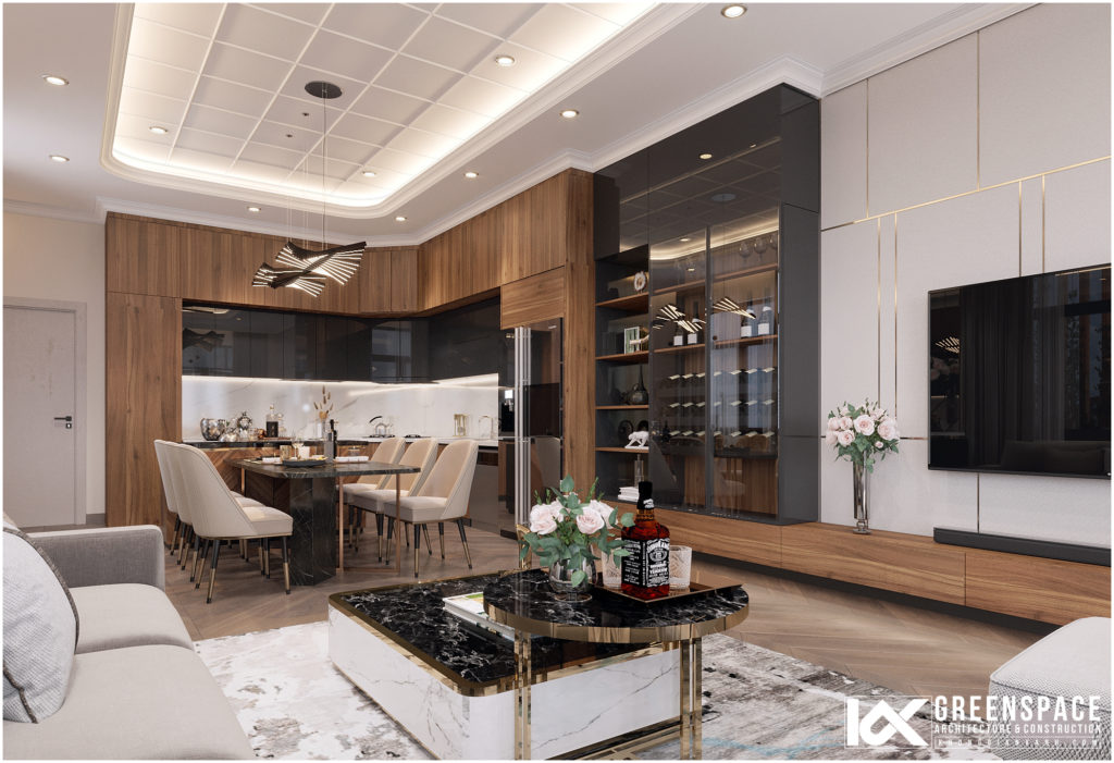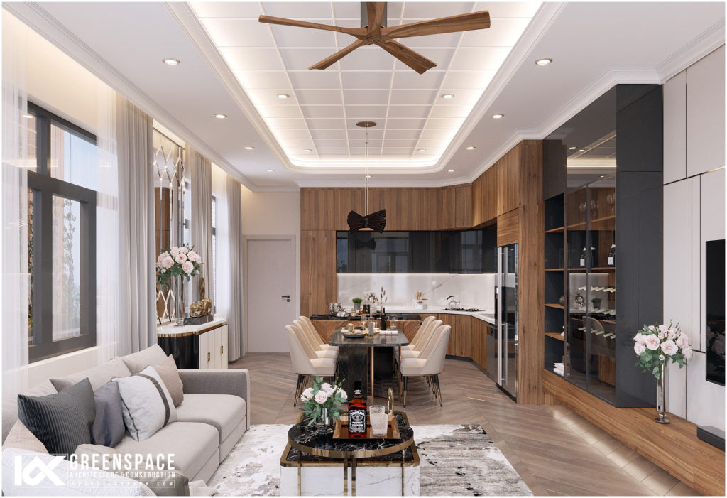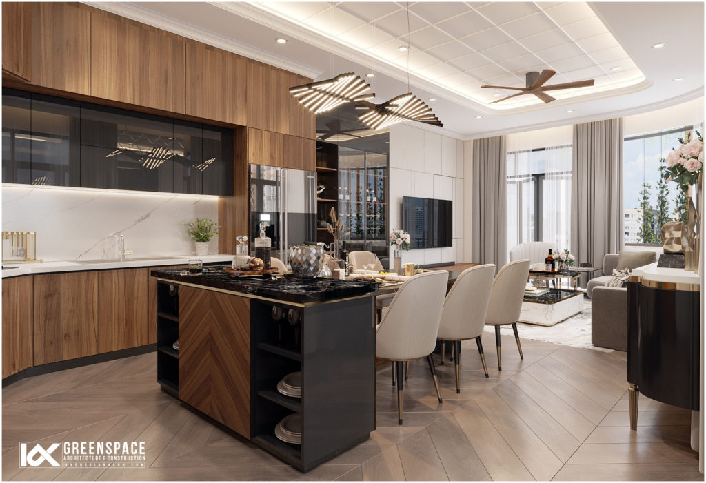 Không gian khách bếp liên hoàn, hệ tủ bếp gam màu gỗ đậm với bố cục gọn gàng đầy đủ công năng, bộ bàn ăn sang trọng kết hợp đảo bếp nhỏ ngăn nhẹ không gian. Khối tủ bếp kết nối với hệ tủ trang trí ti vi một cách logic với bố cục chặt chẽ có tính toán…
