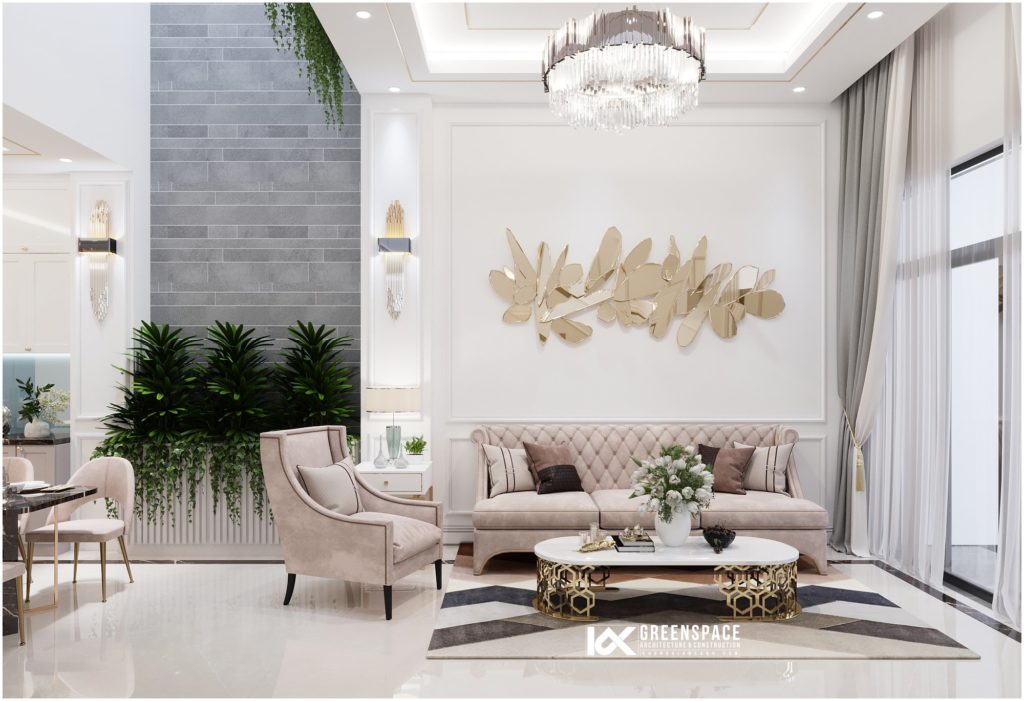 Gam màu trung tính là lựa chọn hoàn hảo cho dự án này, bởi quy mô không lớn, gam màu sáng nhã nhặn sẽ khiến không gian trông rộng rãi hơn nhiều lần. Phòng khách sử dụng bộ sofa màu be kết hợp hệ đèn chùm treo làm điểm nhấn, thiết kế cây xanh khu vực giếng trời mang đến cảm giác tươi mới tràn đầy sức sống cho không gian.