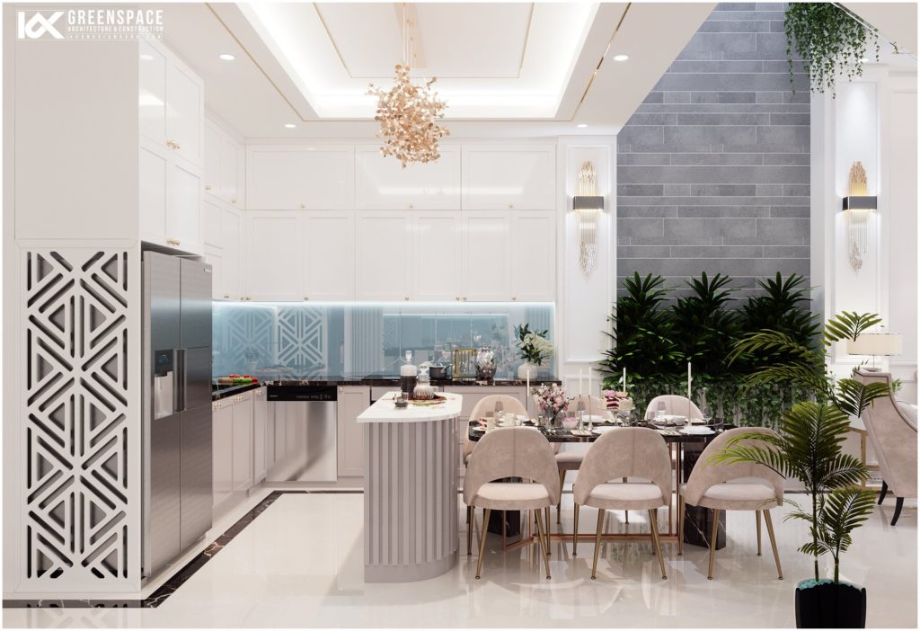 Không gian khách bếp liên hoàn, bộ bàn ăn được bố trí kết hợp bàn đảo ngăn nhẹ với khu bếp tạo nên một dây chuyền công năng hợp lý và đạt yếu tố thẩm mỹ cao….