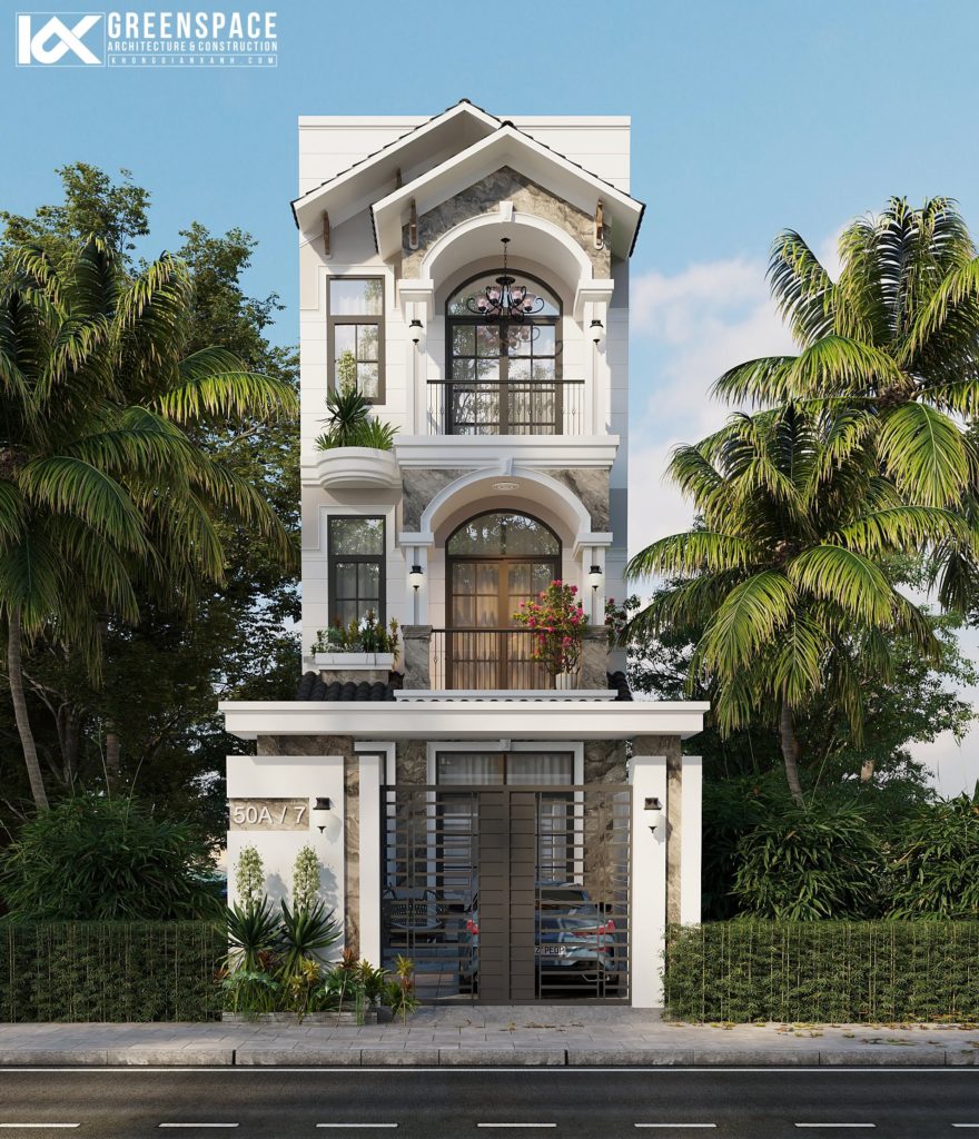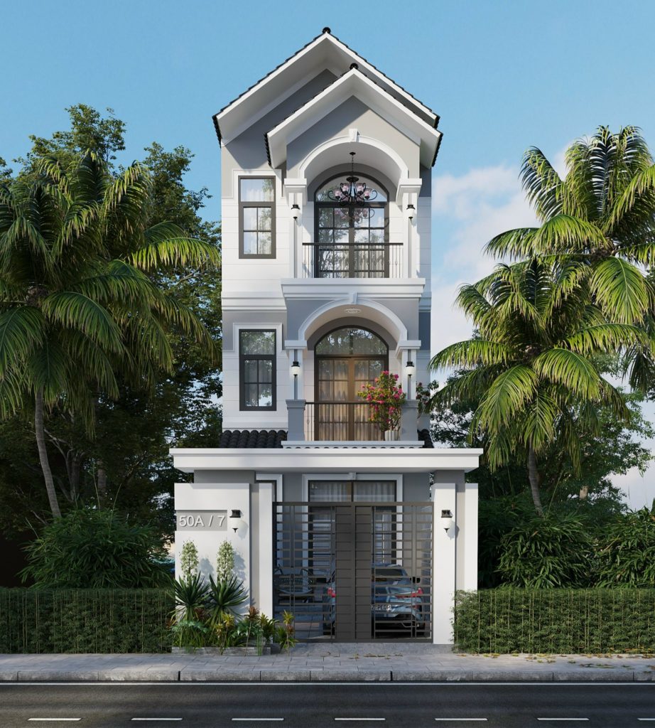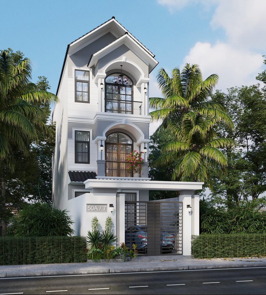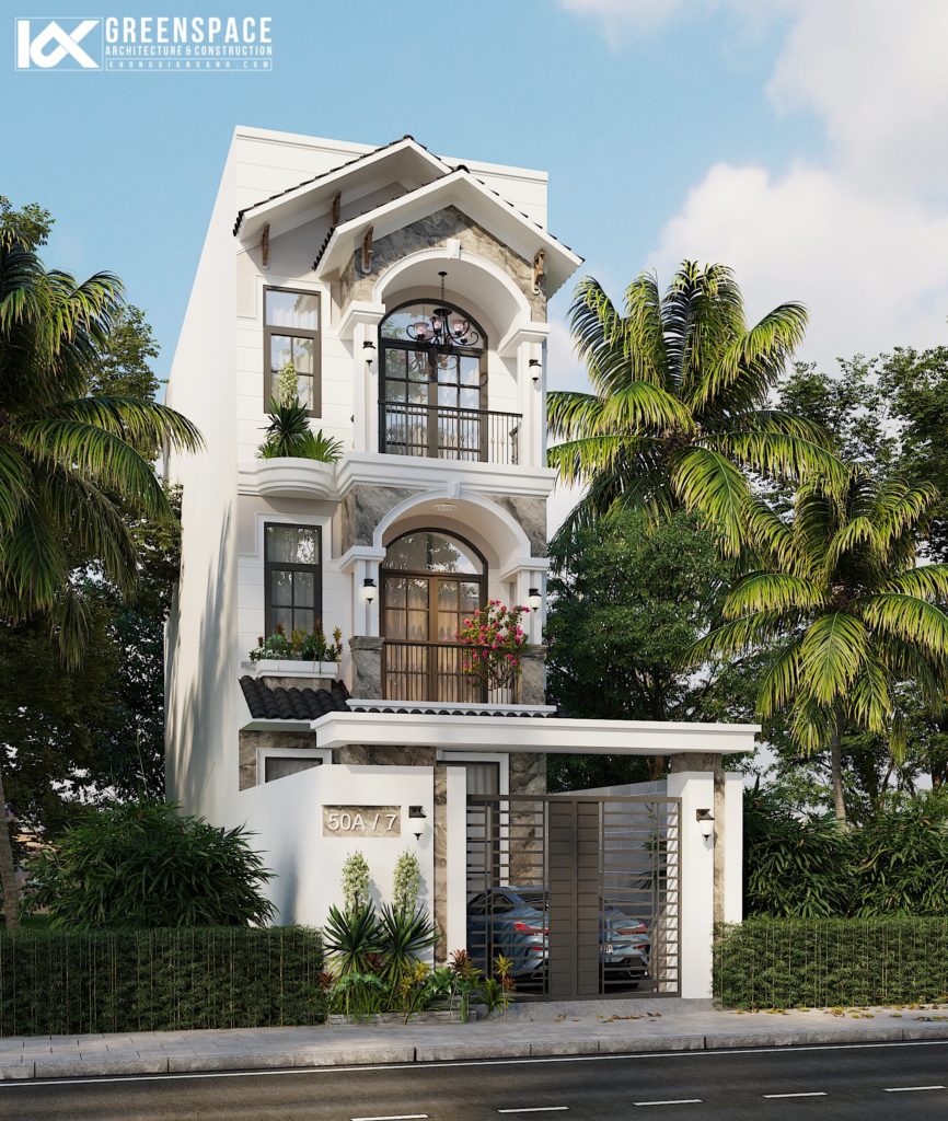 Thiết kế mặt tiền phong cách tân cổ điển sử dụng đường nét phào chỉ hoa văn đơn giản kết hợp gam màu sáng xử lý được vấn đề chiều ngang hạn chế của công trình.