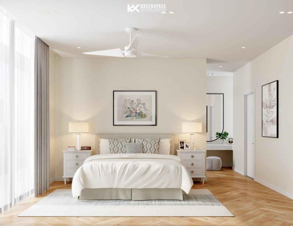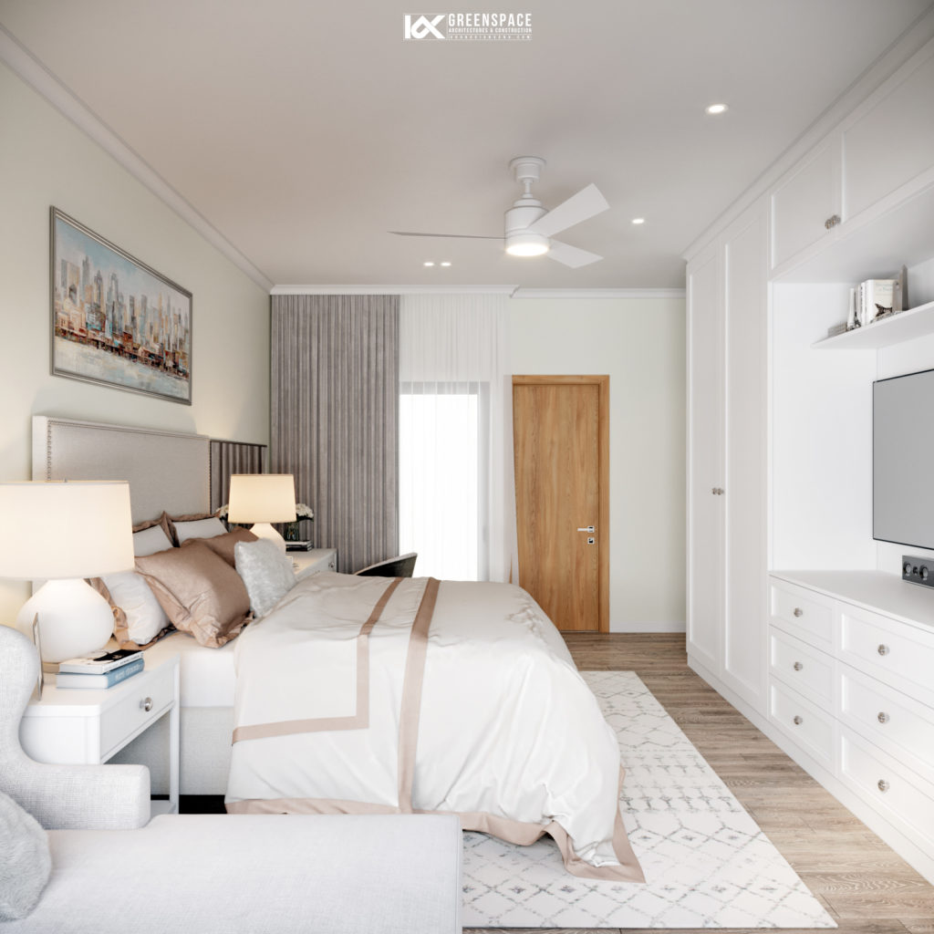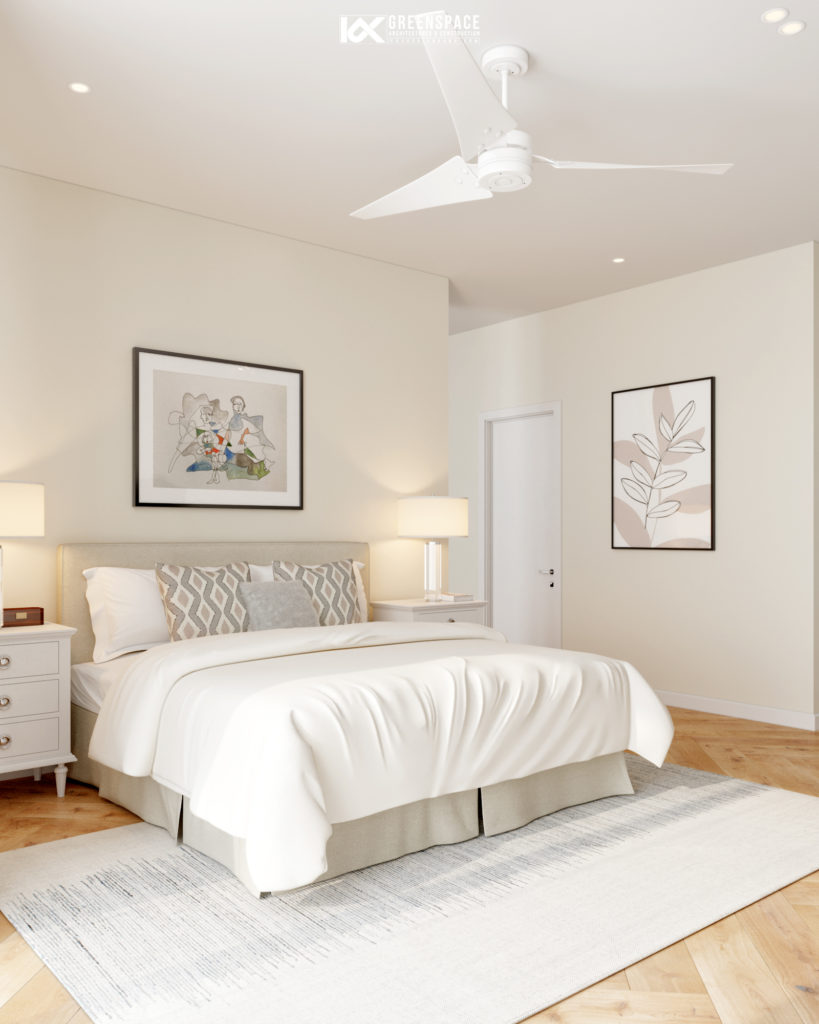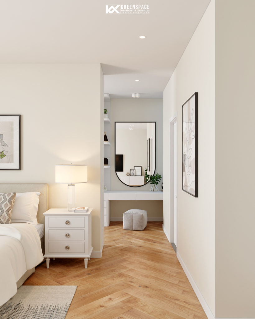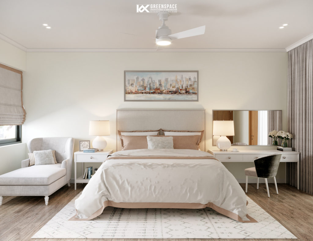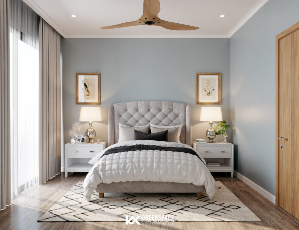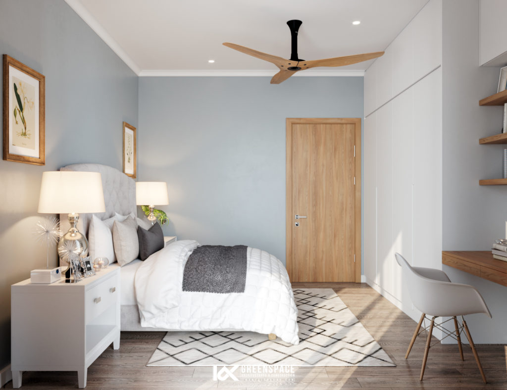 Phòng ngủ được thiết kế đơn giản tinh tế, hạn chế các chi tiết ốp vách trang trí, xử lý bố cục khéo léo mang đến cảm giác gọn gàng rộng rãi. Các họa tiết tranh treo tường… được nhấn nhá để tô diểm thêm cho sự trẻ trung của không gian.