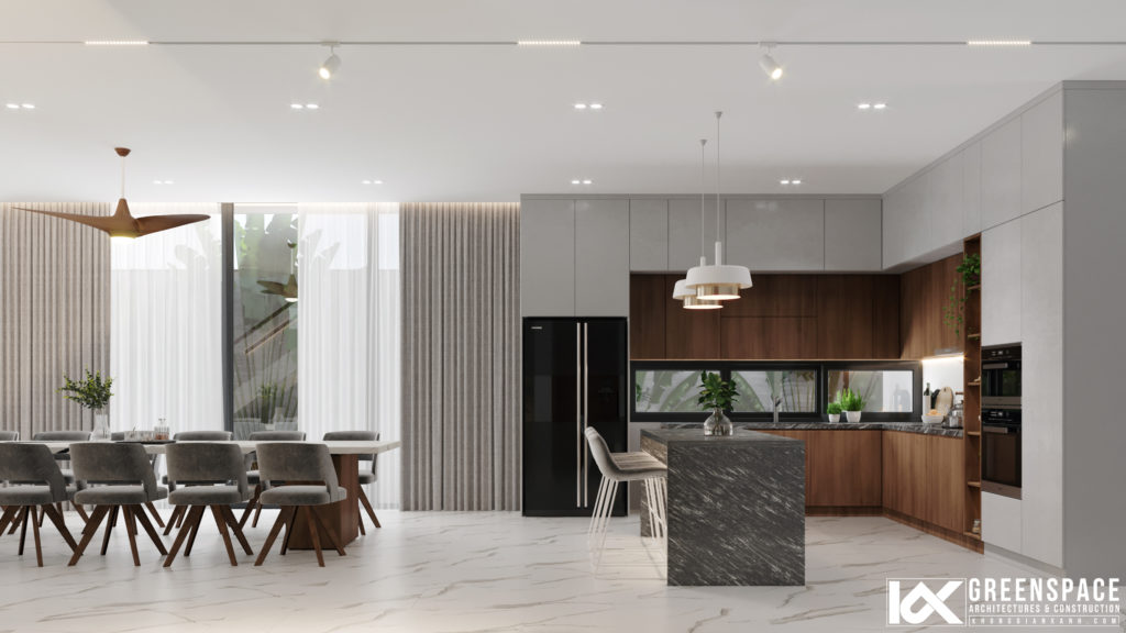 Không gian khách bếp liên hoàn với các ô cửa kính lớn kết nối ra bên ngoài mang đến sự rộng rãi và gần gũi trong lành từ thiên nhiên…