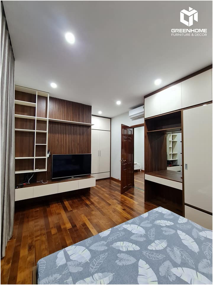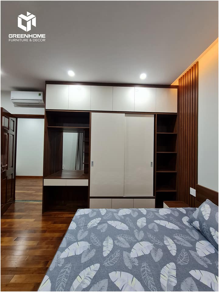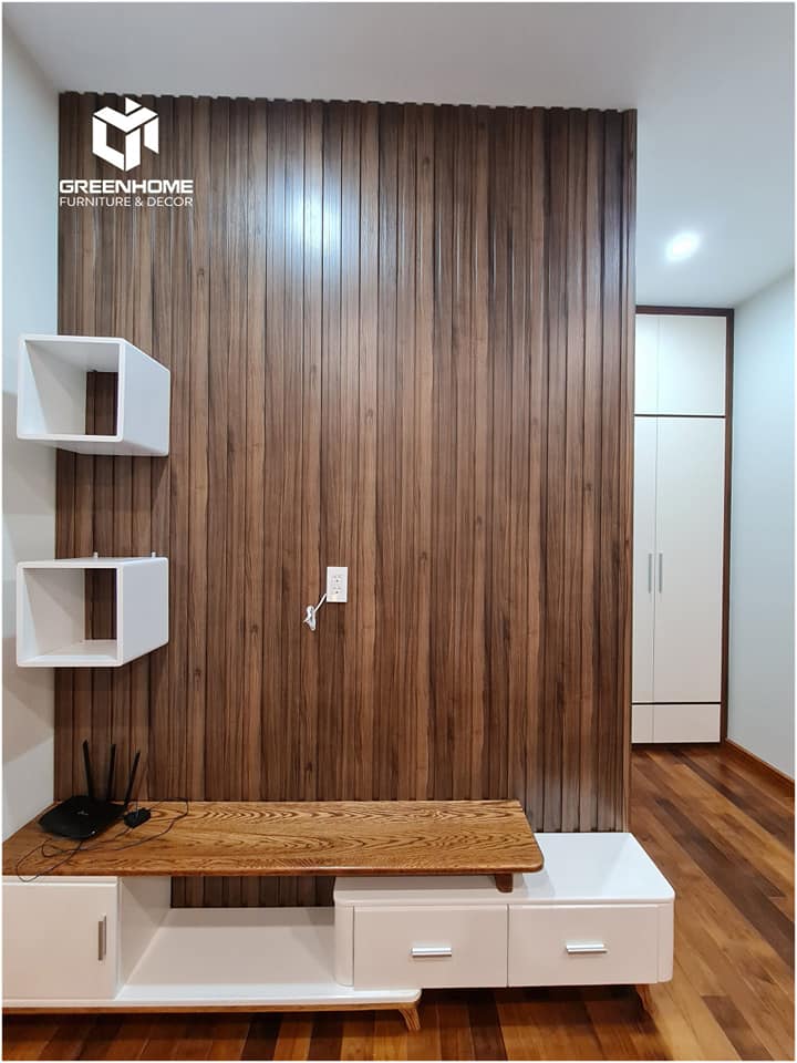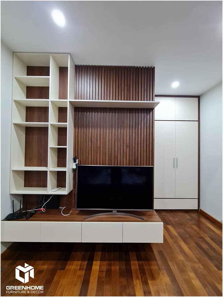 Sử dụng chất liệu gỗ công nghiệp mdf cao cấp với hai gam màu chủ đạo là gỗ đậm và trắng tạo nên nét tương phản hài hòa trong không gian.