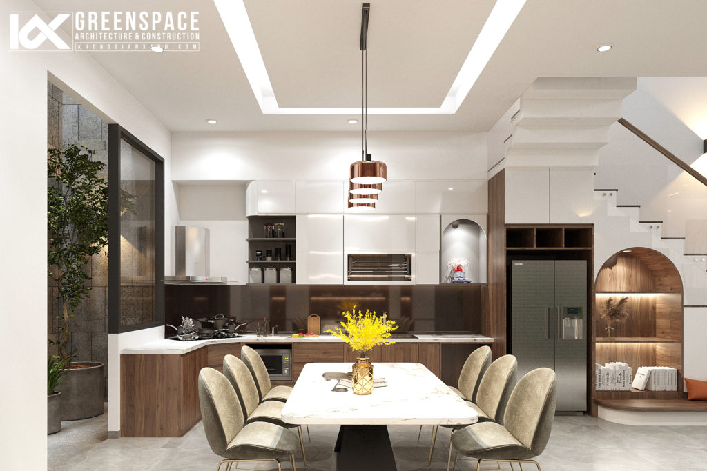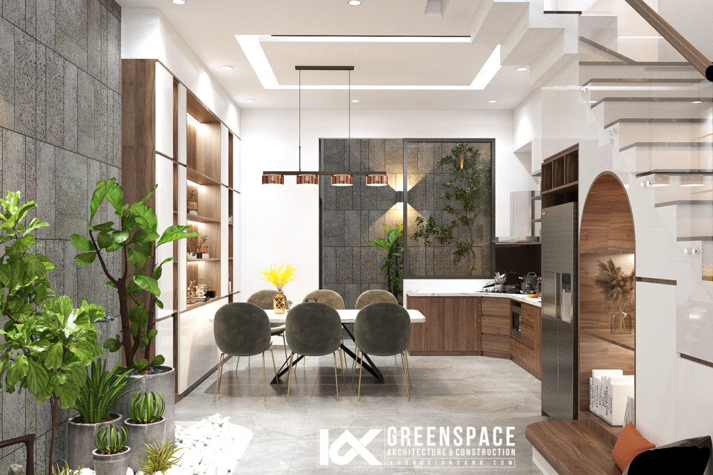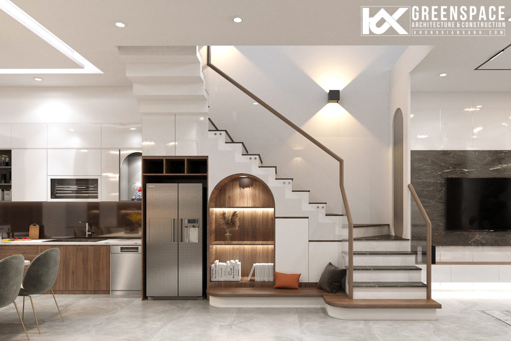 Thiết kế đồ nội thất đơn giản có điểm nhấn, khu bếp tiện nghi với đầy đủ chức năng. Khu thang tạo thành một góc nhỏ đáng yêu kết nối khu thông tầng tiểu cảnh mang đến cho những đứa trẻ không gian vui đùa đọc sách…