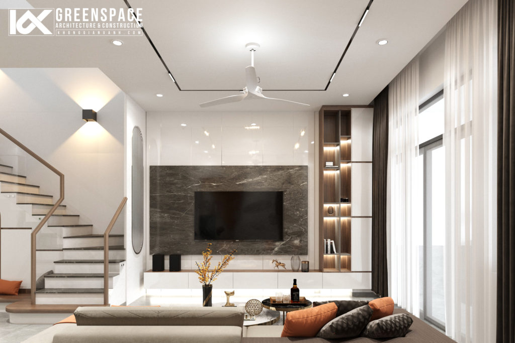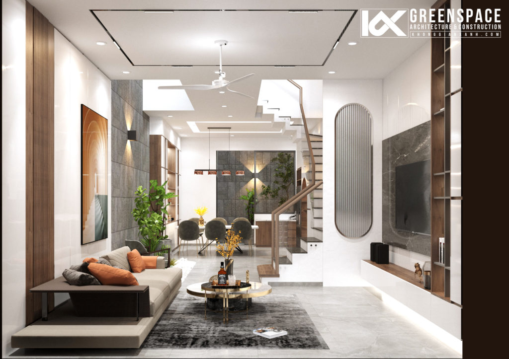 Phòng khách sử dụng gam màu nhã nhặn điểm xuyết một chút nhấn nhá bởi tone cam và nâu của gỗ, với lối thiết kế mở không gian khách bếp liên hoàn kết nối với nhau qua khu thang kết hợp giếng trời thông thoáng…