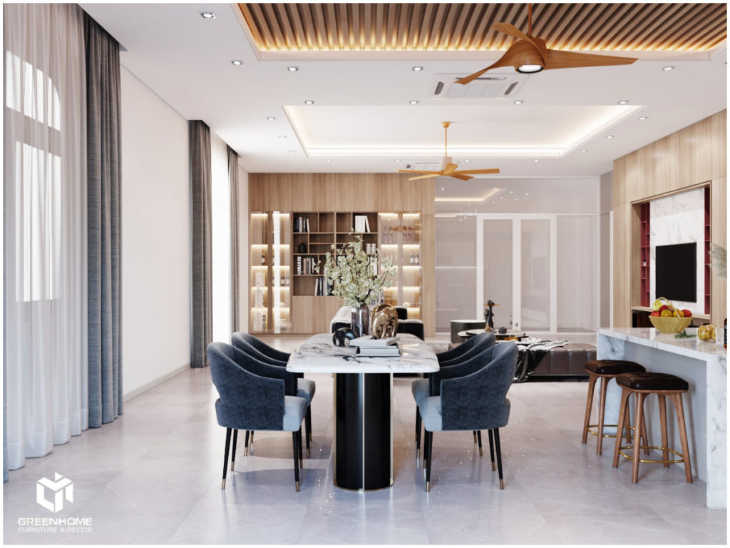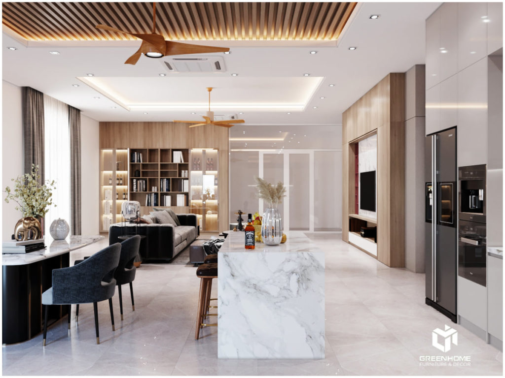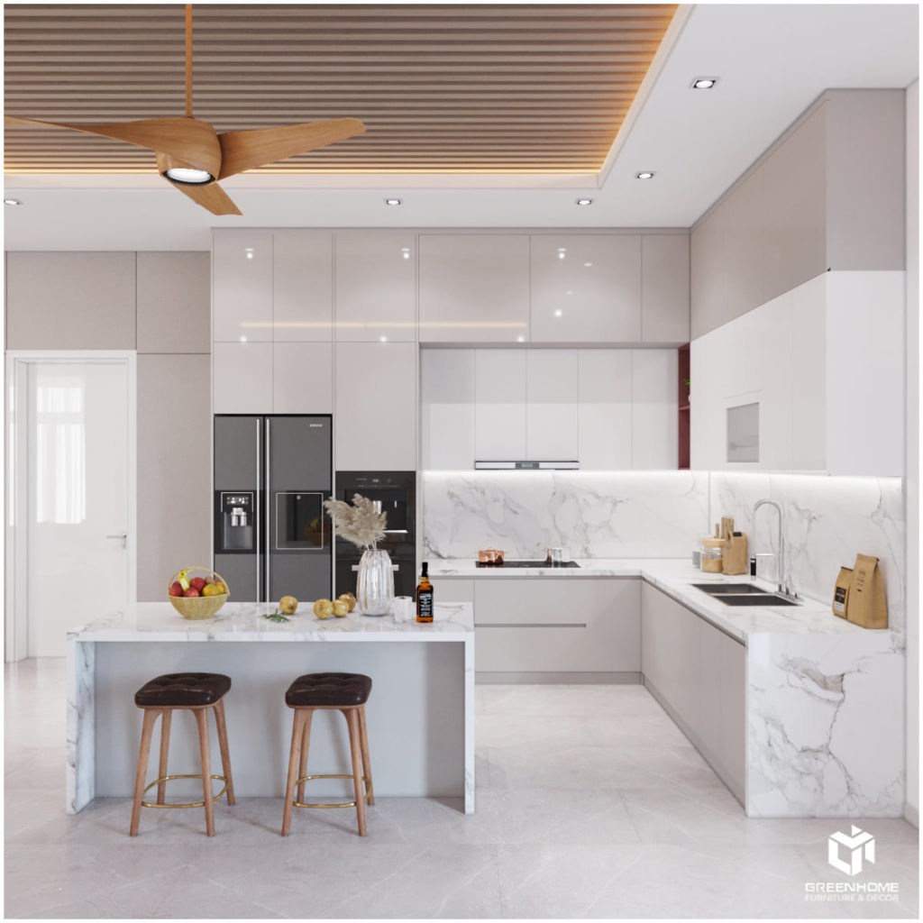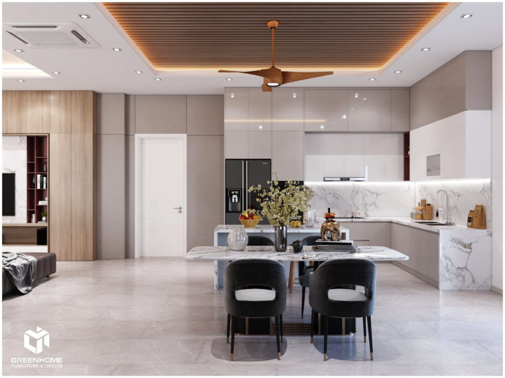 Khu bếp gọn gàng gam màu nhã nhặn ngăn nhẹ với bàn ăn bằng hệ đảo bếp vân đá marble sang trọng mang đến bố cục thẩm mỹ và tiện nghi trong sử dụng…