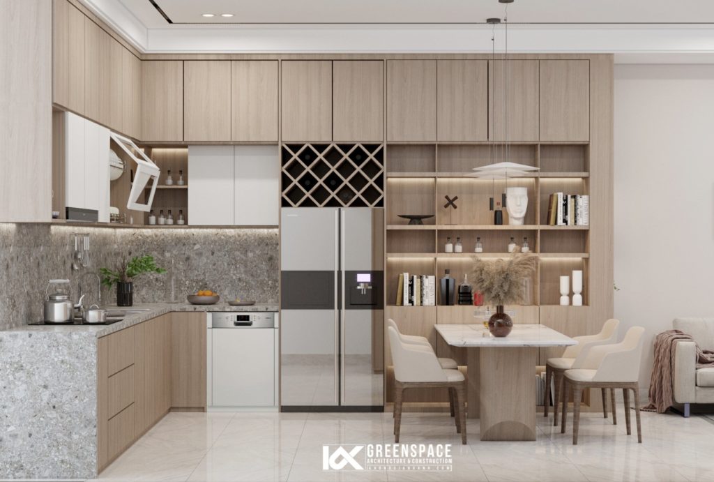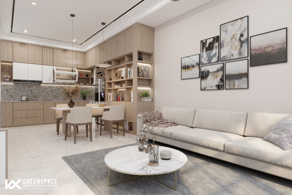 Sử dụng gam màu trung tính trên nền màu trắng kết hợp tone gỗ trầm khiến không gian trở nên dịu dàng bắt mắt. Không gian khách bếp liên hoàn mang đến cảm giác rộng rãi thoải mái.