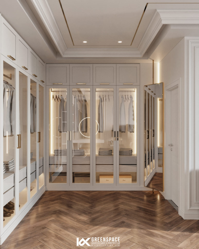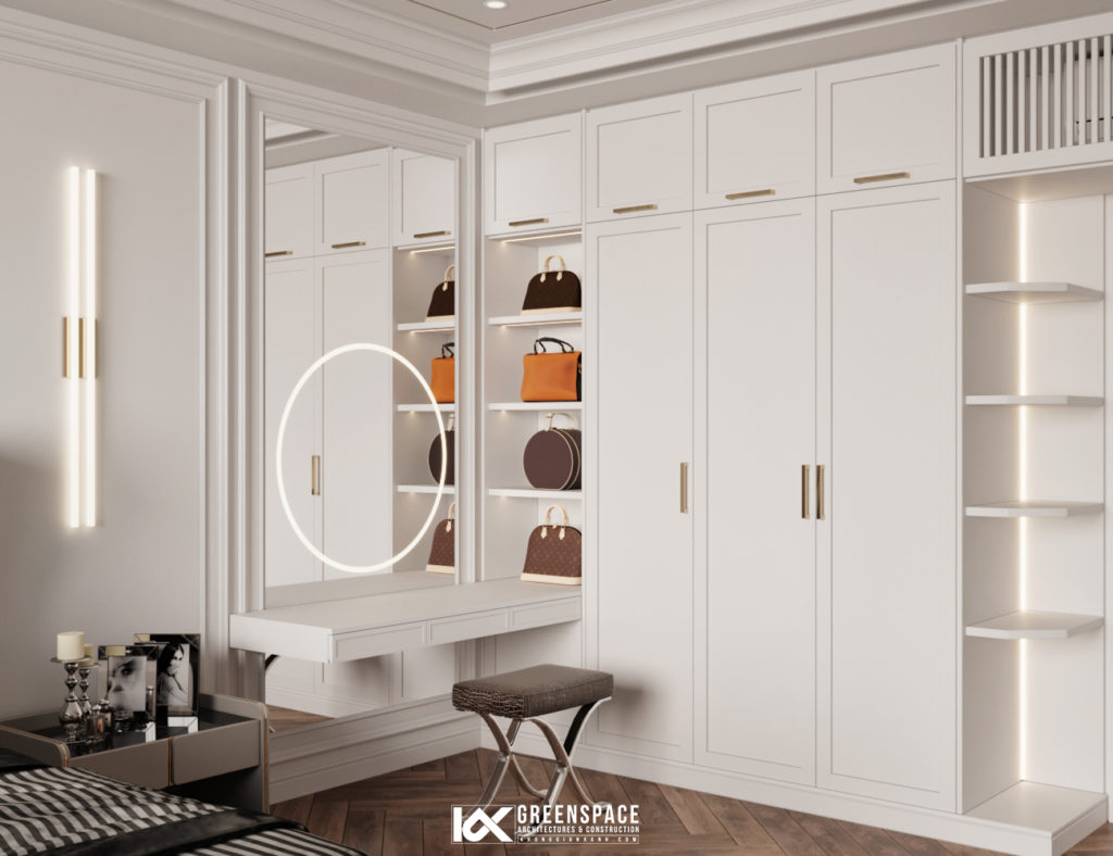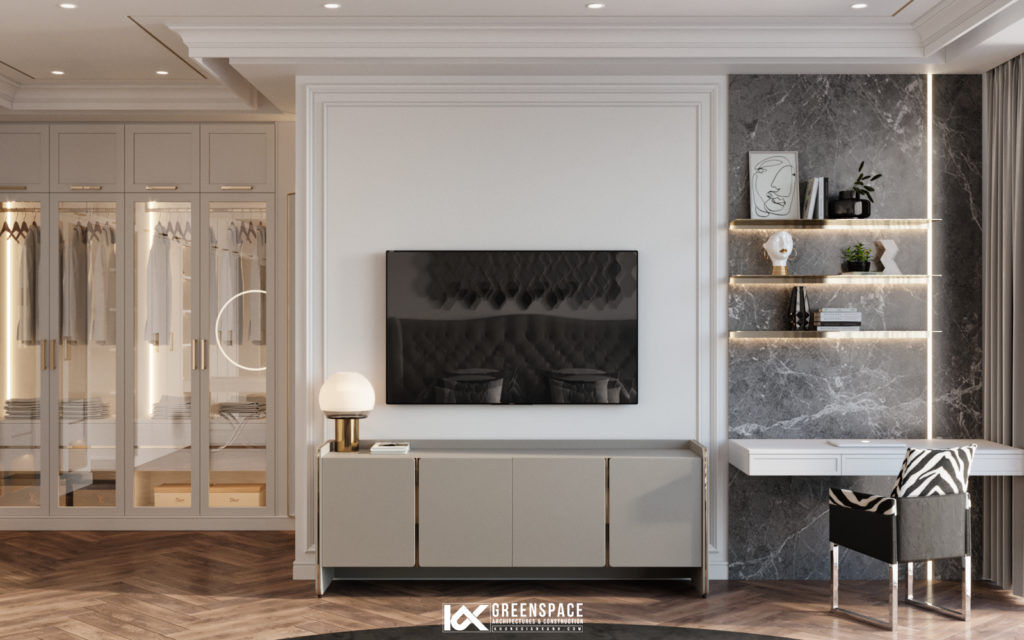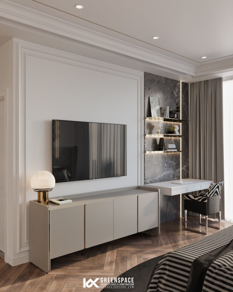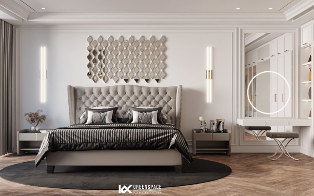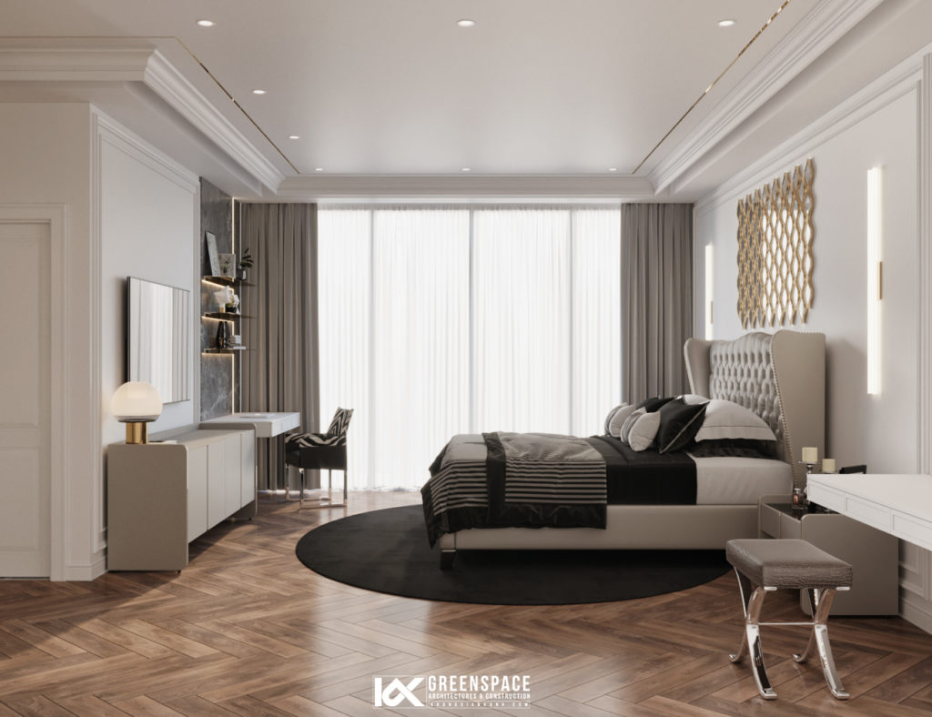Không gian riêng tư hơn như phòng ngủ được lựa chọn phong cách tân cổ điển sang trọng, vẫn sử dụng gam màu sáng trung tính để không quá lệch tone so với tổng thể…