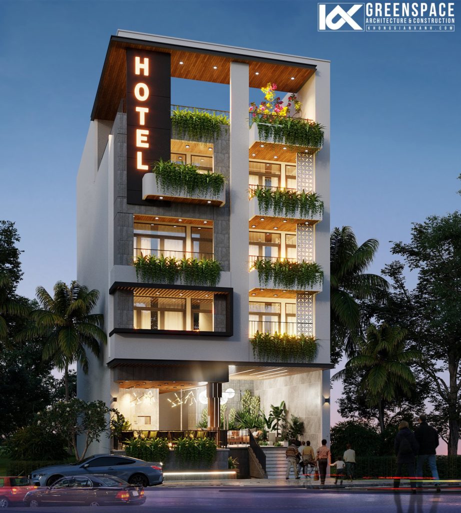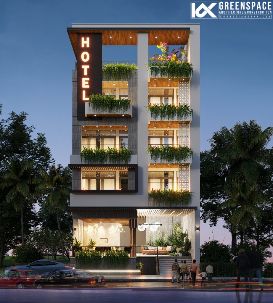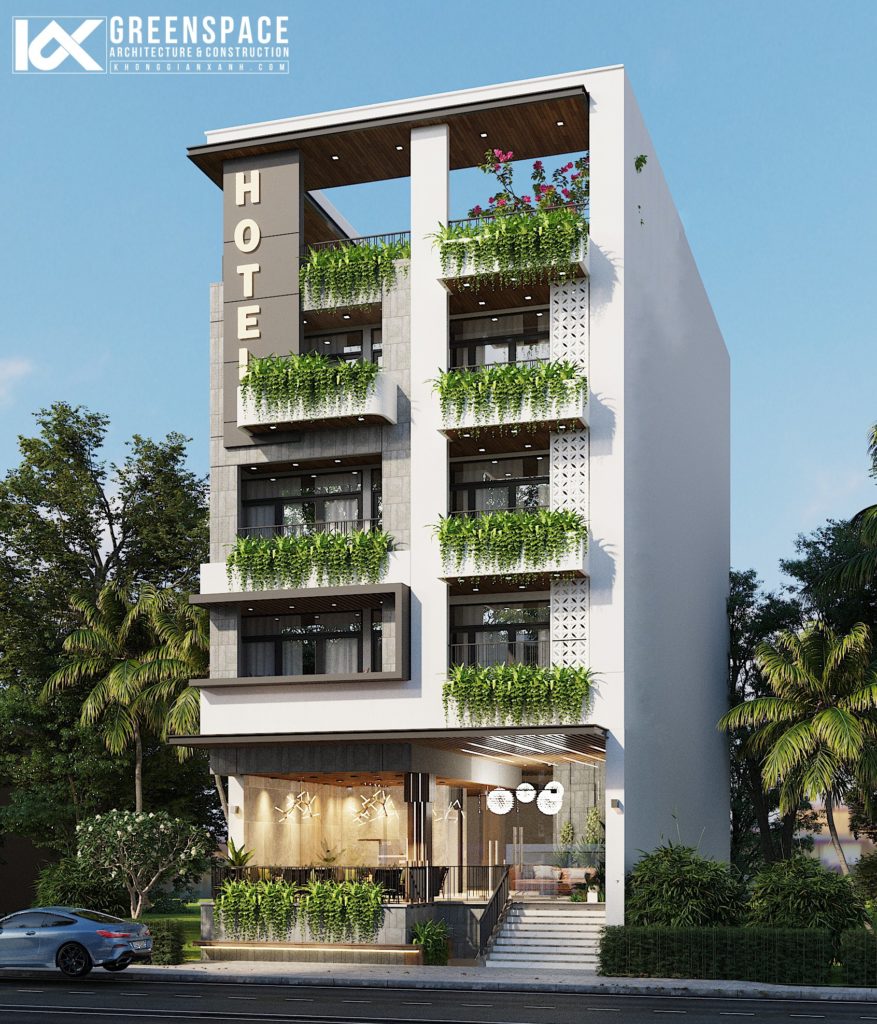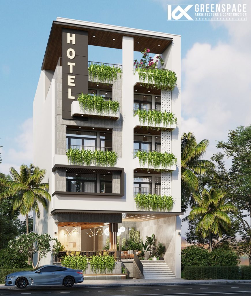 Thiết kế khách sạn 5 tầng hiện đại mang đến cho bạn cảm giác nhẹ nhàng với không gian gần gũi với thiên nhiên. Khách sạn được thiết kế với những đường nét hình khối đơn giản, tạo điểm nhấn.