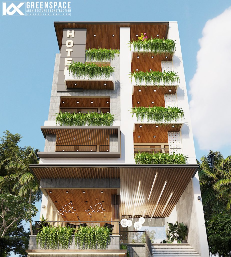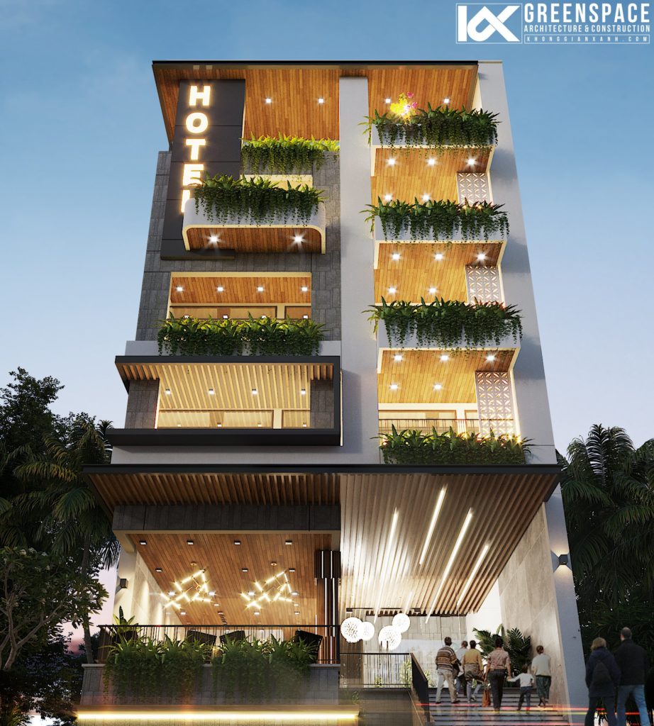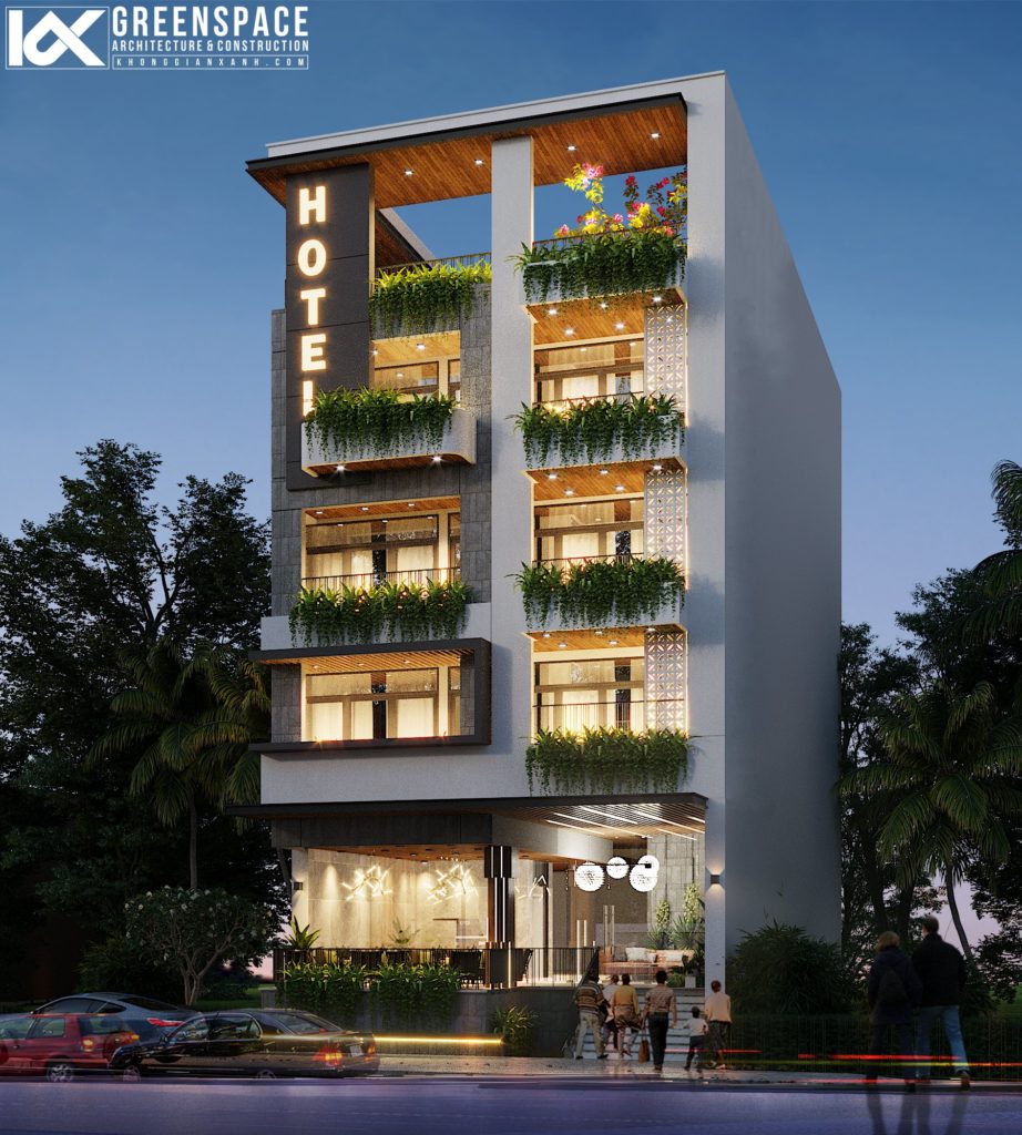 Thiết kế khách sạn 5 tầng hiện đại mang đến cho bạn cảm giác nhẹ nhàng với không gian gần gũi với thiên nhiên. Khách sạn được thiết kế với những đường nét hình khối đơn giản, tạo điểm nhấn.
