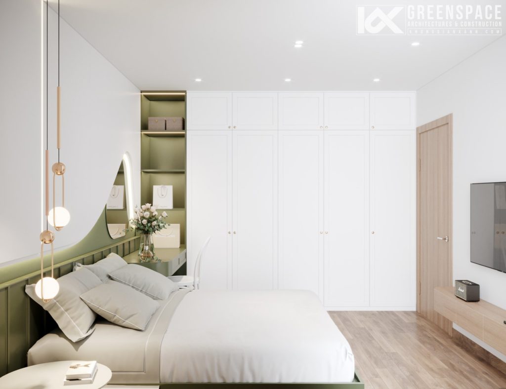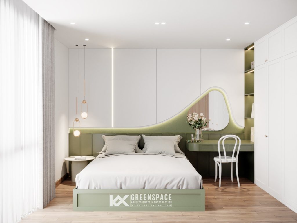 Đối với 2 phòng này, Kiến trúc sư vẫn sử dụng 2 tông màu trắng – xanh kết hợp nhằm tạo nên sự xuyên suốt và hài hòa về tổng thể. Trong đó, vách đầu giường phòng ngủ master sử dụng ánh sáng và đường cong để tạo điểm nhấn. Các đường cong không chỉ thẩm mỹ mà còn tạo nên sự mềm mại và thoải mái cho không gian phòng ngủ.