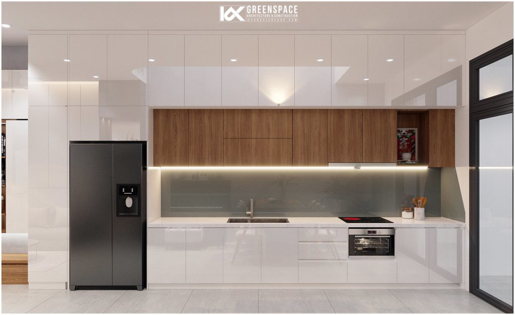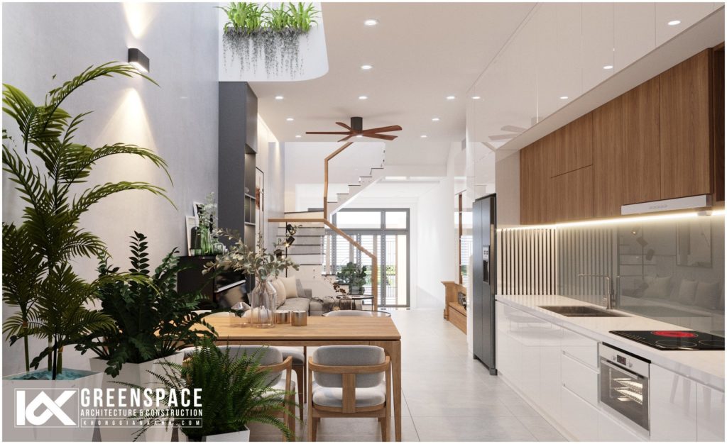 Nội thất nhà phố 3 tầng được bố trí phòng bếp – ăn với không gian thoải mái, tiện nghi. Tủ bếp chữ I kết hợp cùng bộ bàn ăn làm từ chất liệu gỗ tạo nên không gian ấm cúng và sang trọng.