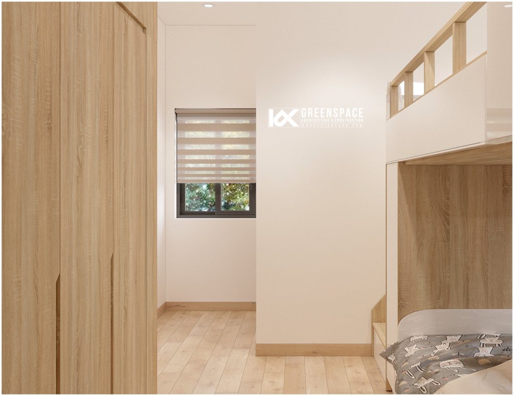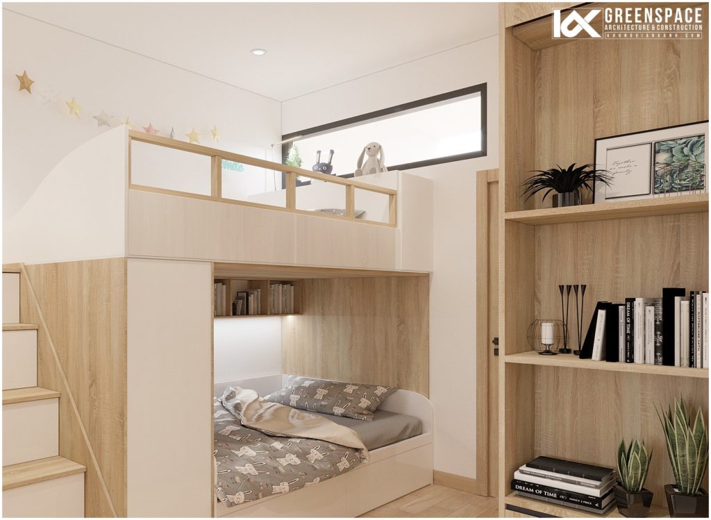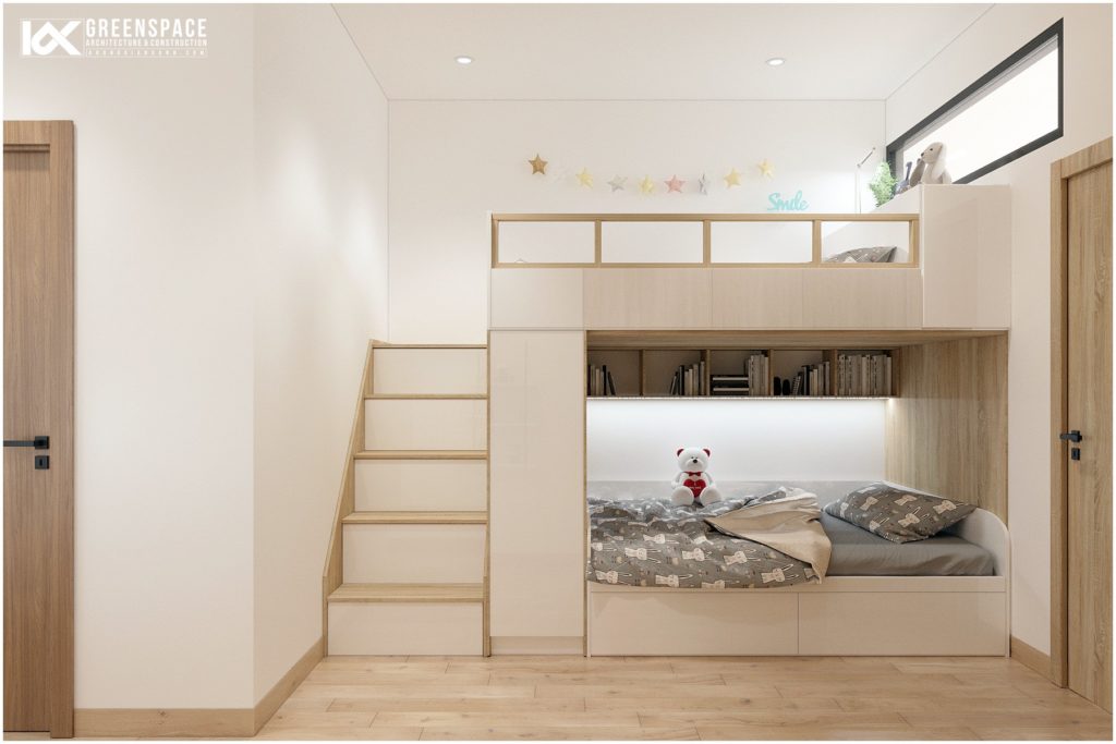 Phòng ngủ cho bé được thiết kế theo kiểu giường tầng vừa tiện nghi vừa tiết kiệm diện tích. Việc tích hợp các hộc chứa bên dưới giường tầng giúp tạo ra không gian dự trữ đồ linh động cho các bé giúp tiết kiệm không gian tối ưu.