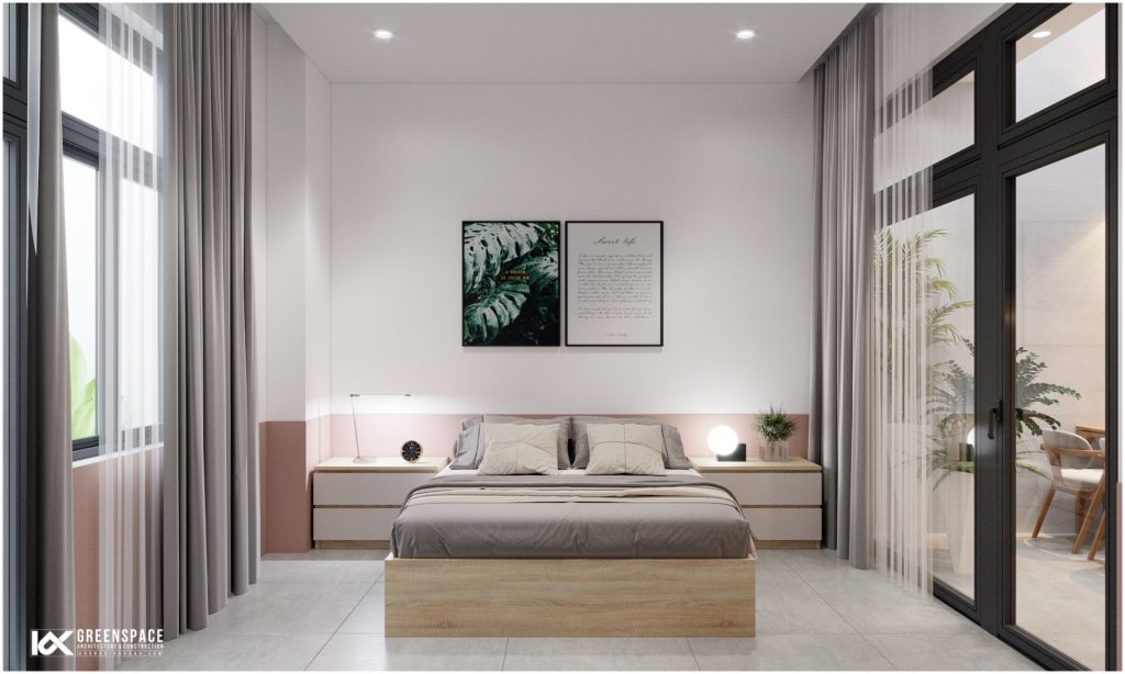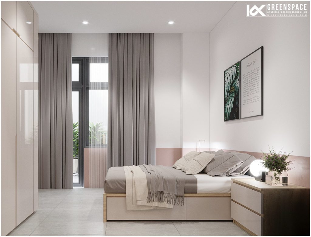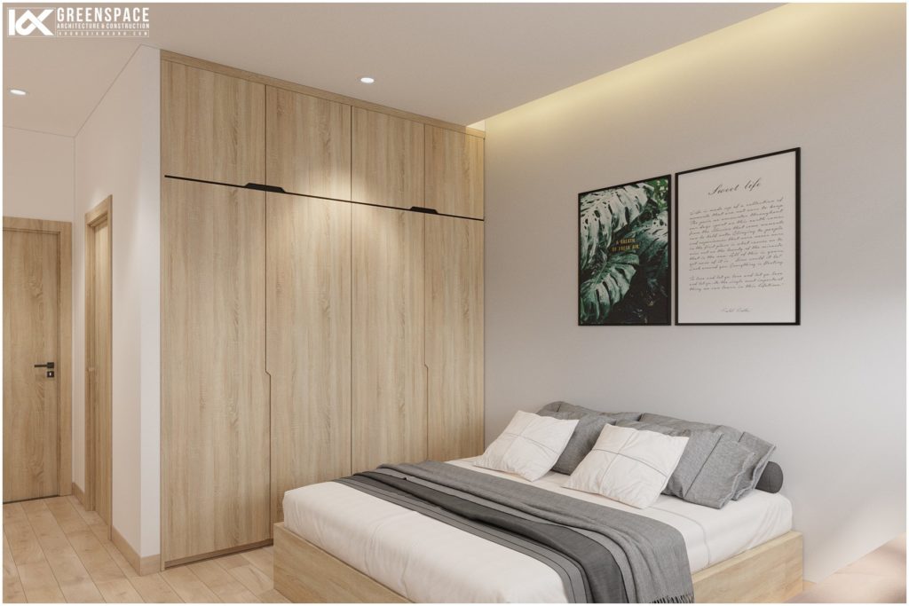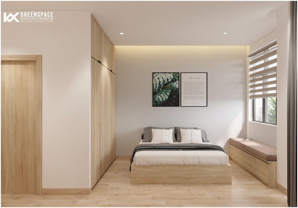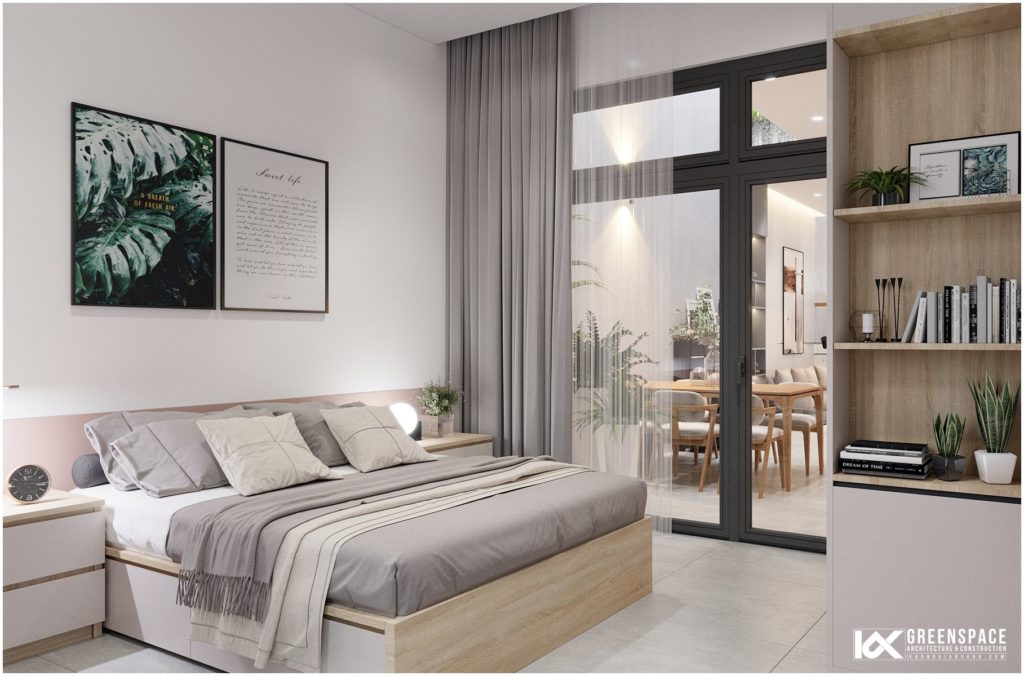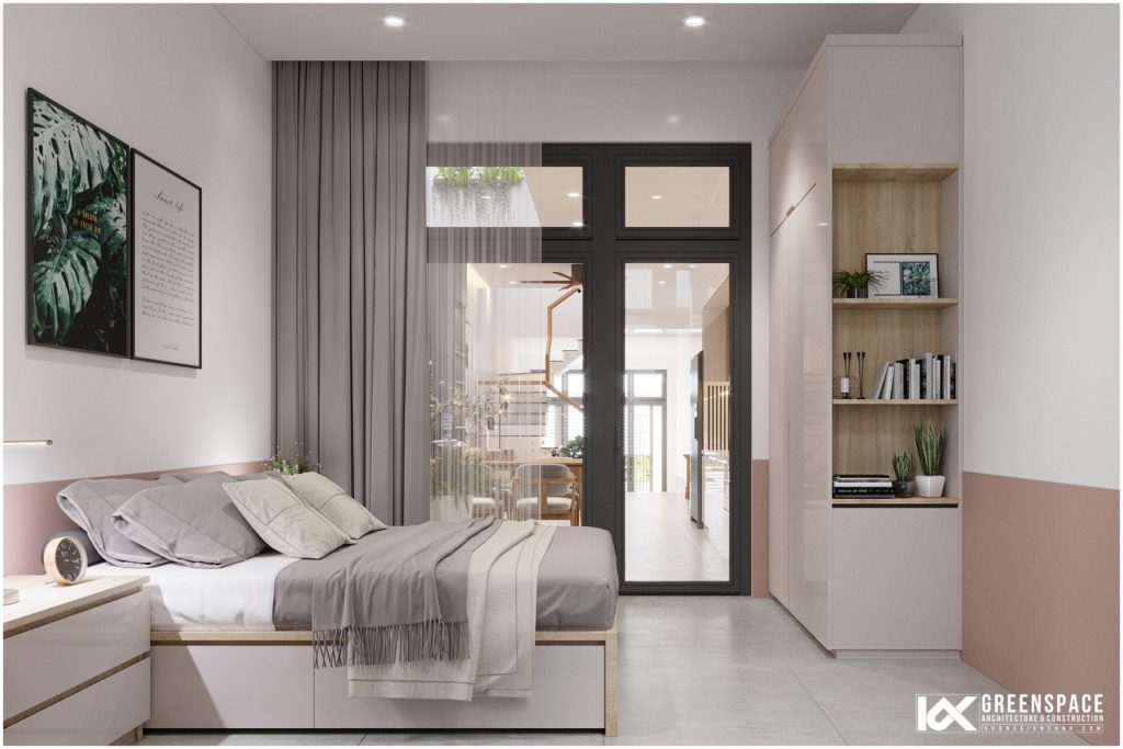 Nội thất phòng ngủ tầng 1 được thiết kế đơn giản, ngăn cách với phòng bếp – ăn bằng hệ cửa kính. Giường ngủ được thiết kế có ngăn kéo đa năng, giúp gia chủ để đồ thuận tiện mà gọn gàng, sạch sẽ. Gam màu phòng ngủ tầng 1 nhẹ nhàng, giúp không gian trở nên thông thoáng và mới mẻ.