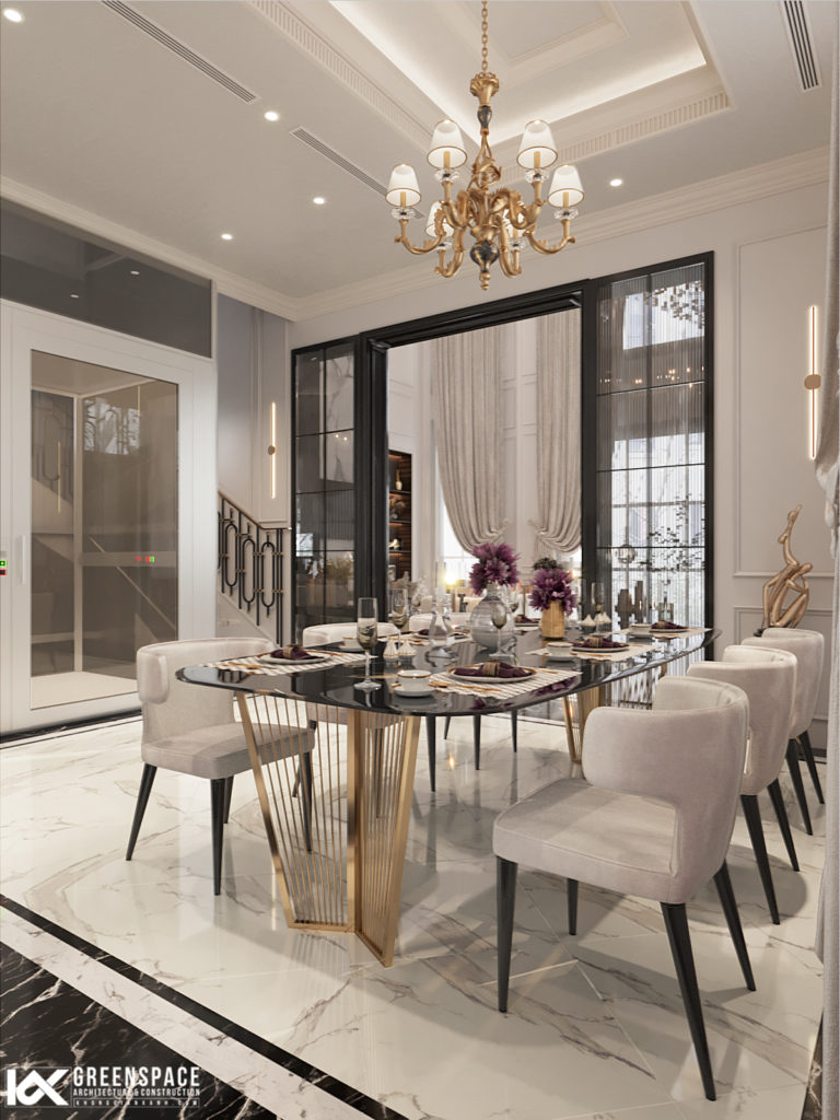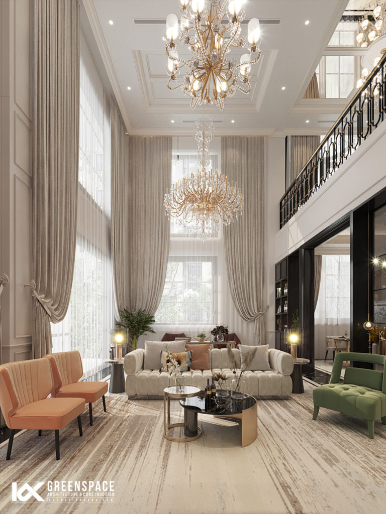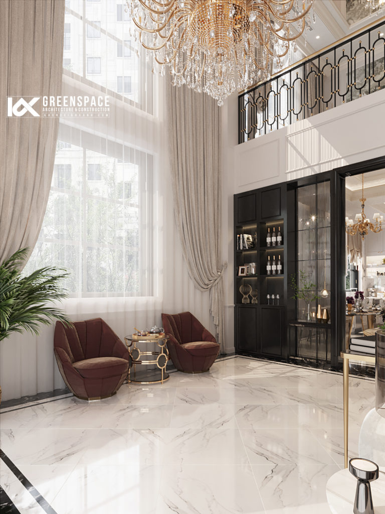 Toàn bộ không gian lấy màu trắng và kem làm chủ đạo tạo cảm giác hài hòa và thông thoáng, xóa bỏ đi sự ngột ngạt của những ngôi nhà phố. Thiết kế nội thất phong cách tân cổ điển tạo ấn tượng với sự đơn giản, cân đối trong các đường nét thiết kế, mang đến một không gian thanh lịch và sang trọng. Đồng thời, kiến trúc sư đã thiết kế nhiều cửa kính lớn độc đáo để cân bằng ánh sáng tự nhiên kết hợp với những sản phẩm nội thất cao cấp mang lại một không gian sang trọng và thanh lịch.