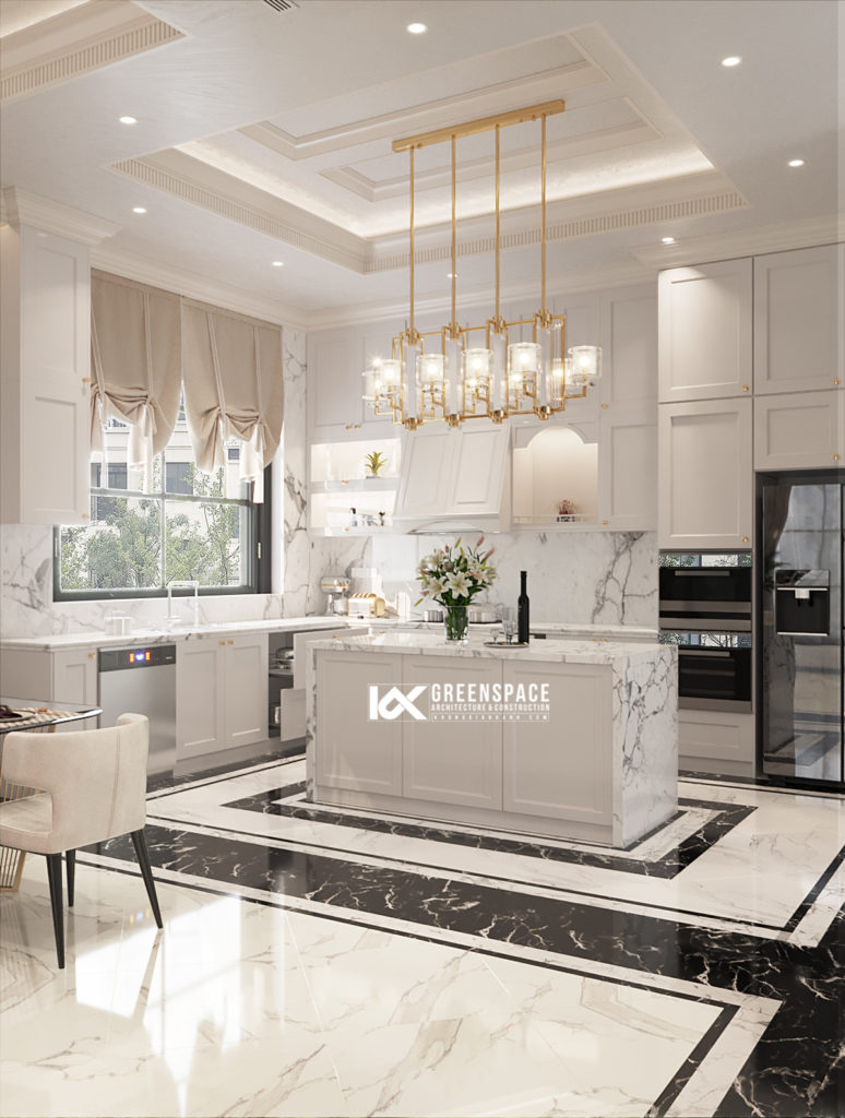 Nội thất phòng bếp tân cổ điển chú trọng sự giản đơn, cân đối từng đường nét nhỏ nhưng vẫn mang lại sự sang trọng và thanh lịch.