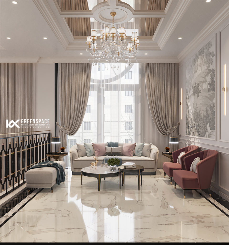 Không gian nội thất của gia chủ Mr. Luân được kiến trúc sư Không Gian Xanh bố trí, sắp xếp một cách tinh tế, hài hòa và mang tính thẩm mỹ cao. Những đường phào chỉ cùng bộ rèm và hệ đèn trần… là những nhân tố tạo nên sự nhẹ nhàng, mềm mại và đầy cuốn hút ngay từ cái nhìn đầu tiên.