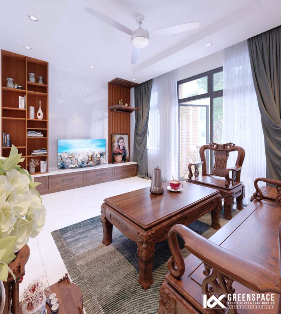 Nội thất phòng khách anh Khoa được thiết kế đơn giản, bao gồm bộ bàn ghế gỗ được điêu khắc tinh tế và kệ tivi kết hợp để đồ trang trí. Phòng khách được gia chủ sử dụng quạt trần và hạn chế đồ nội thất cầu kỳ, rườm rà. Chính vì thế, khi bước vào phòng khách, bạn sẽ cảm nhận được sự thông thoáng nhưng không kém phần thẩm mỹ.