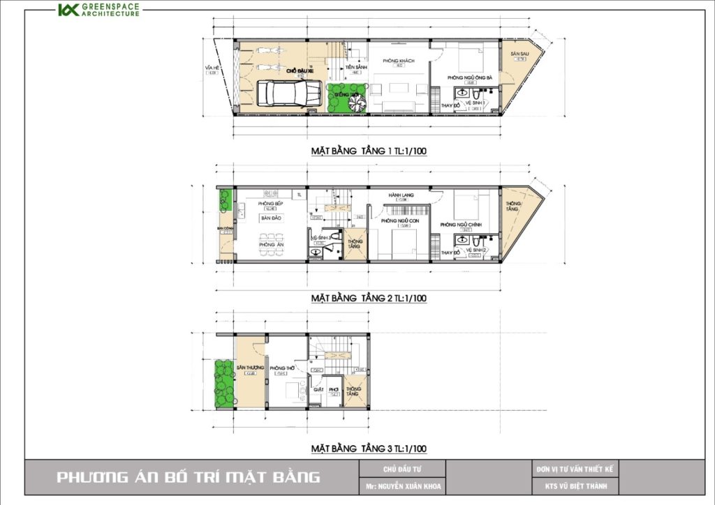 Phương án bố trí mặt bằng 3 tầng nhà phố Anh Khoa.