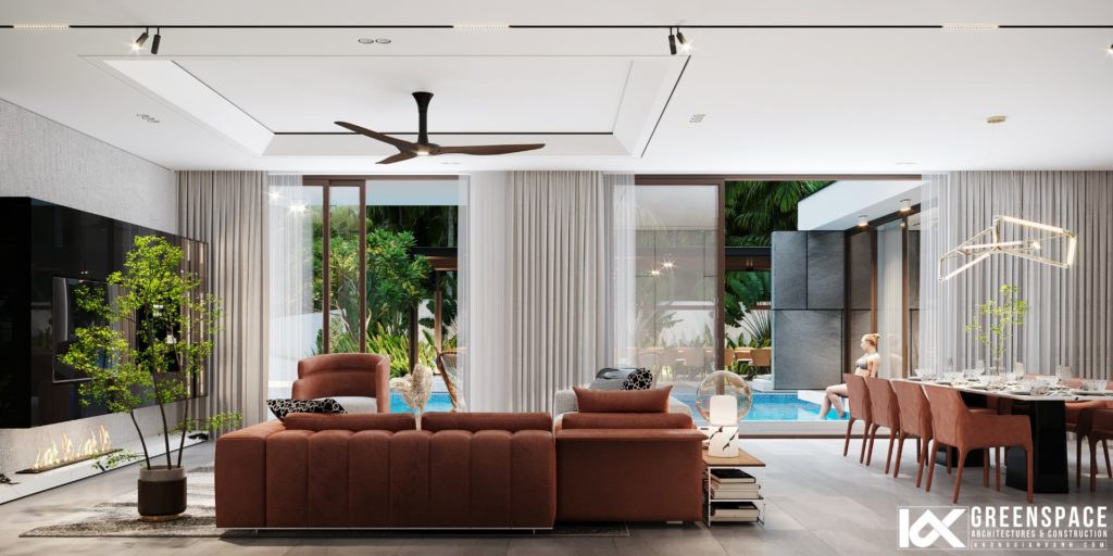 Không gian phòng khách không chỉ là không gian cả nhà quây quần, sum họp mà còn là bộ mặt của biệt thự, gây ấn tượng và tạo thiện cảm với khách đến thăm. Phòng khách biệt thự được thiết kế ở vị trí trung tâm, ánh sáng hài hòa và lưu thông khí tự nhiên tốt.