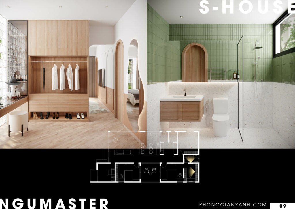Từ đó tạo nên một thiết kế kiến trúc – nội thất toàn diện, hài hoà, kết hợp nét hiện đại và cổ điển trong hình khối kiến trúc, đan xen khối vuông vức và những mảng bo cong.