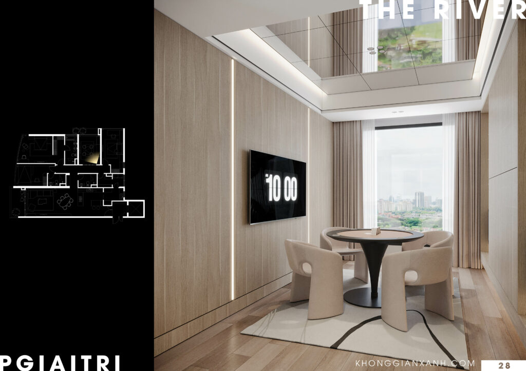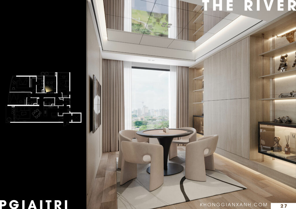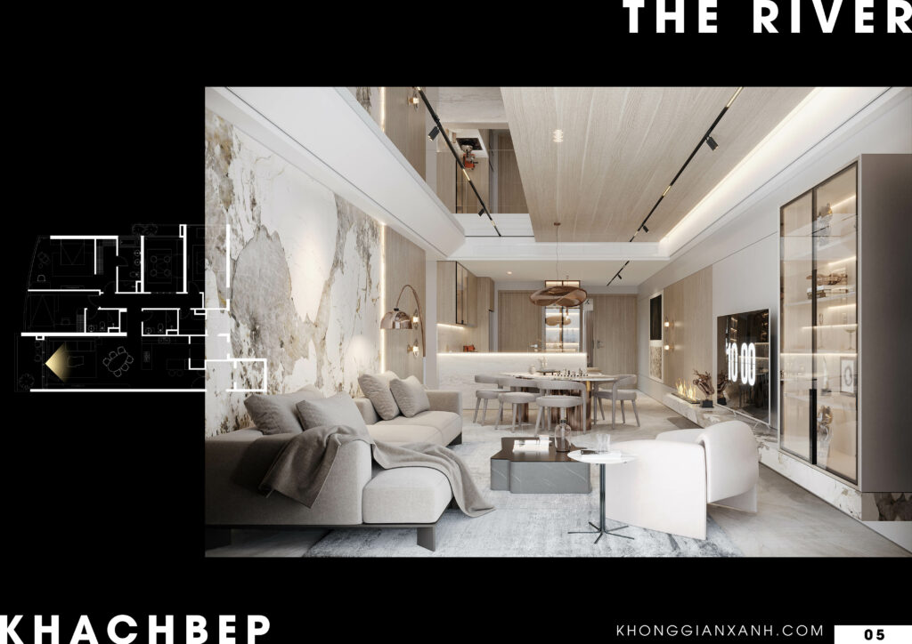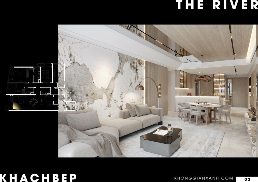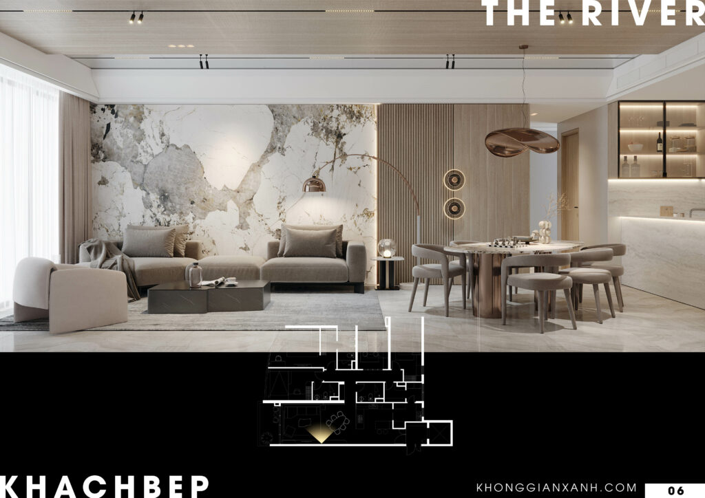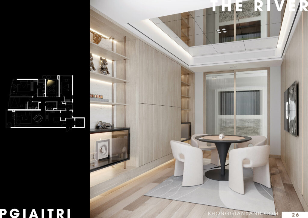 Tiếp nối ý tưởng tổng thể dự án mang dấu ấn thượng lưu, không gian thoáng đãng và tăng cường kết nối tự nhiên. KTS Không Gian Xanh lên phương án cho chủ đầu tư tối ưu công năng và thẩm mỹ cho nội thất căn hộ The River Thủ Thiêm này.