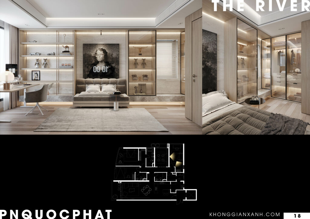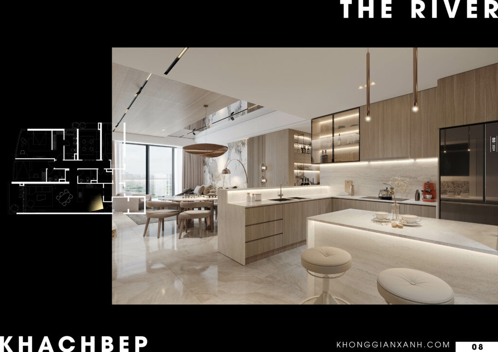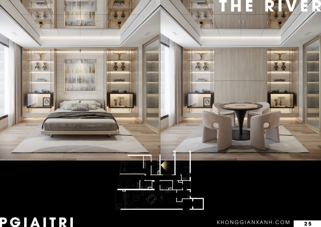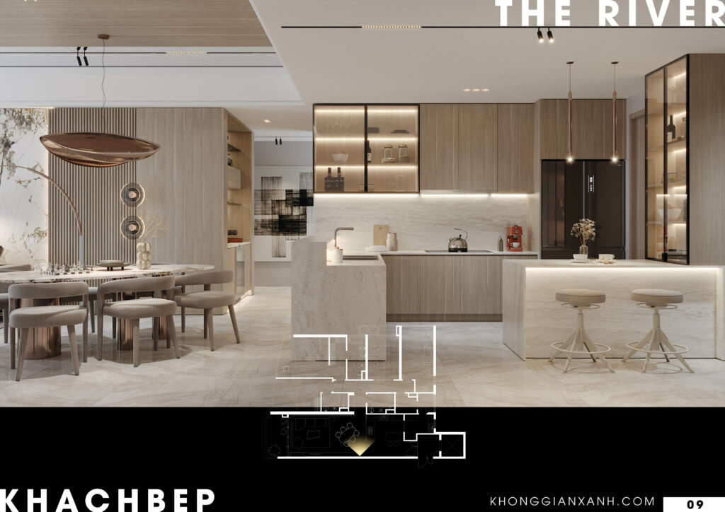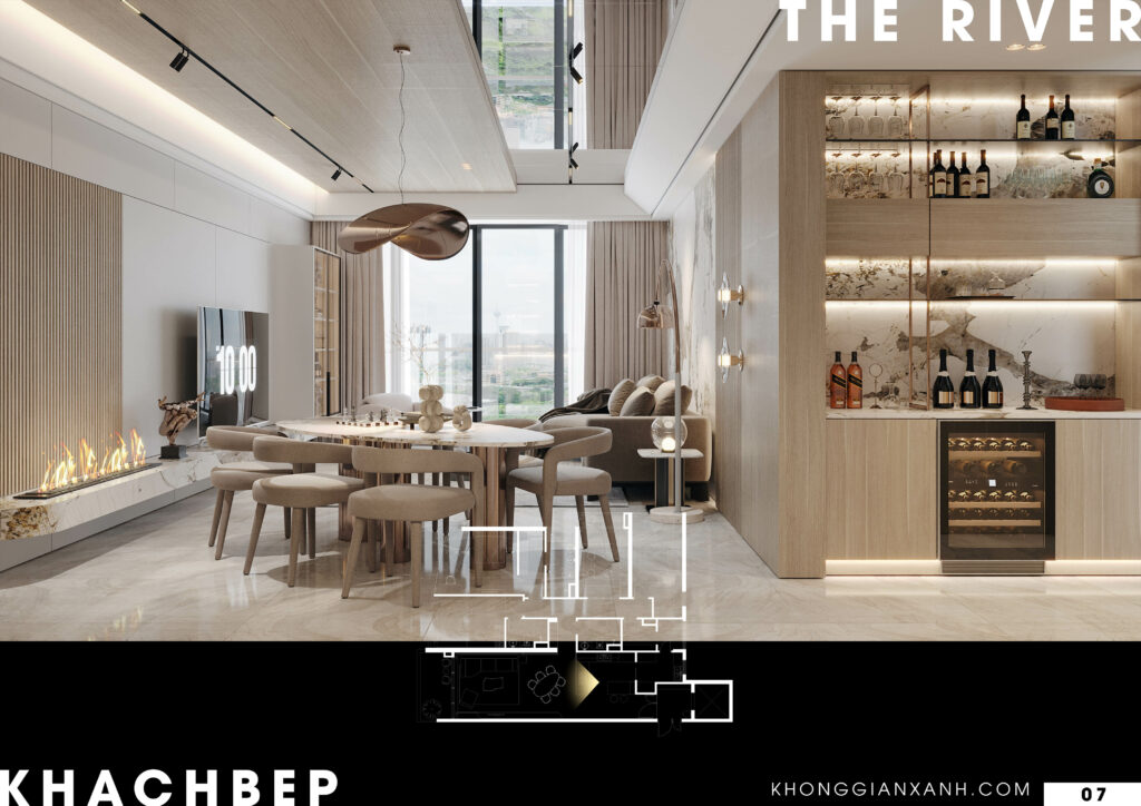 Tiếp nối ý tưởng tổng thể dự án mang dấu ấn thượng lưu, không gian thoáng đãng và tăng cường kết nối tự nhiên. KTS Không Gian Xanh lên phương án cho chủ đầu tư tối ưu công năng và thẩm mỹ cho nội thất căn hộ The River Thủ Thiêm này.