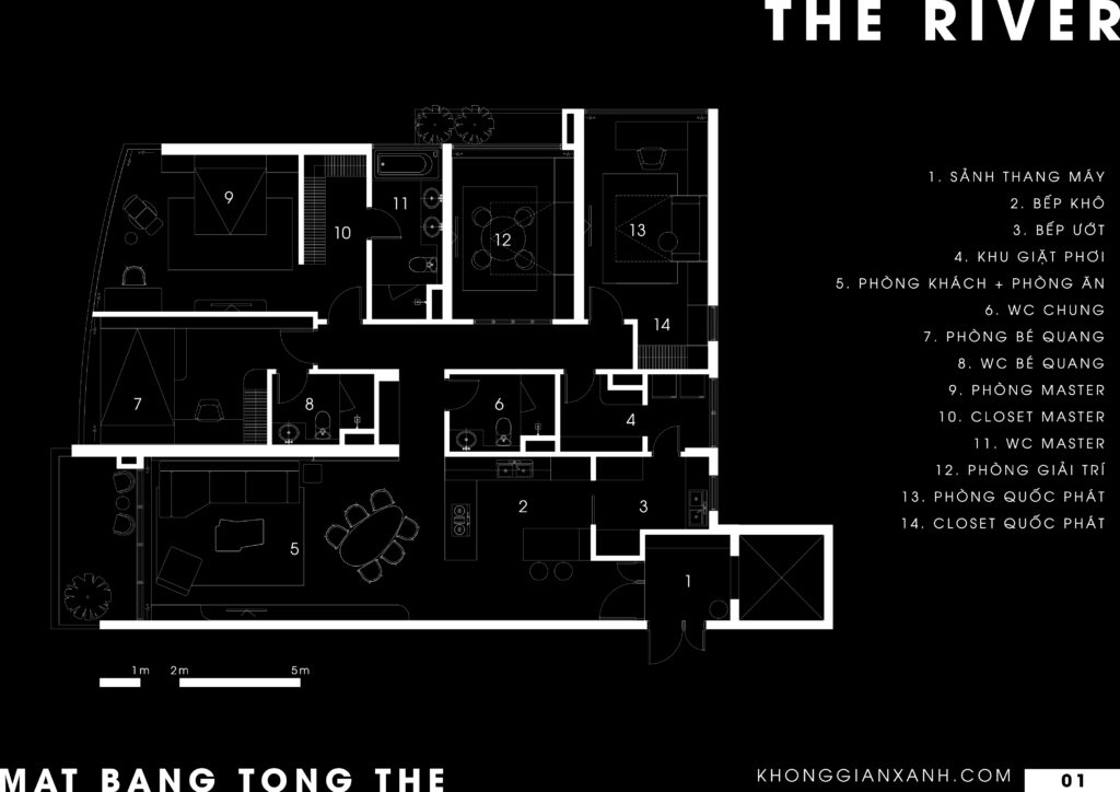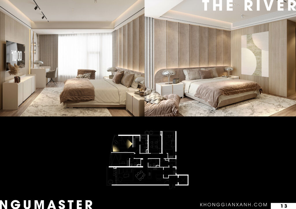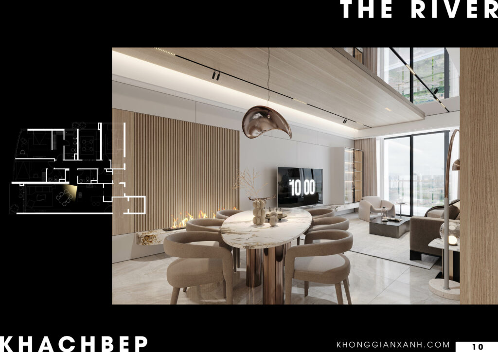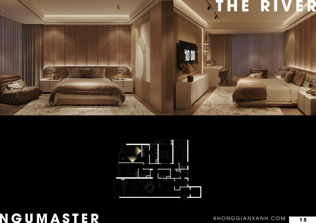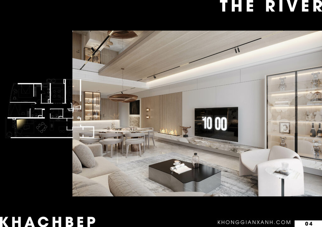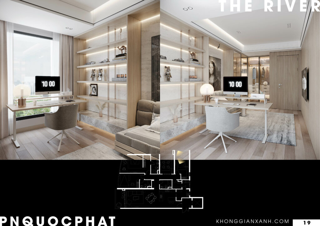 Tiếp nối ý tưởng tổng thể dự án mang dấu ấn thượng lưu, không gian thoáng đãng và tăng cường kết nối tự nhiên. KTS Không Gian Xanh lên phương án cho chủ đầu tư tối ưu công năng và thẩm mỹ cho nội thất căn hộ The River Thủ Thiêm này.