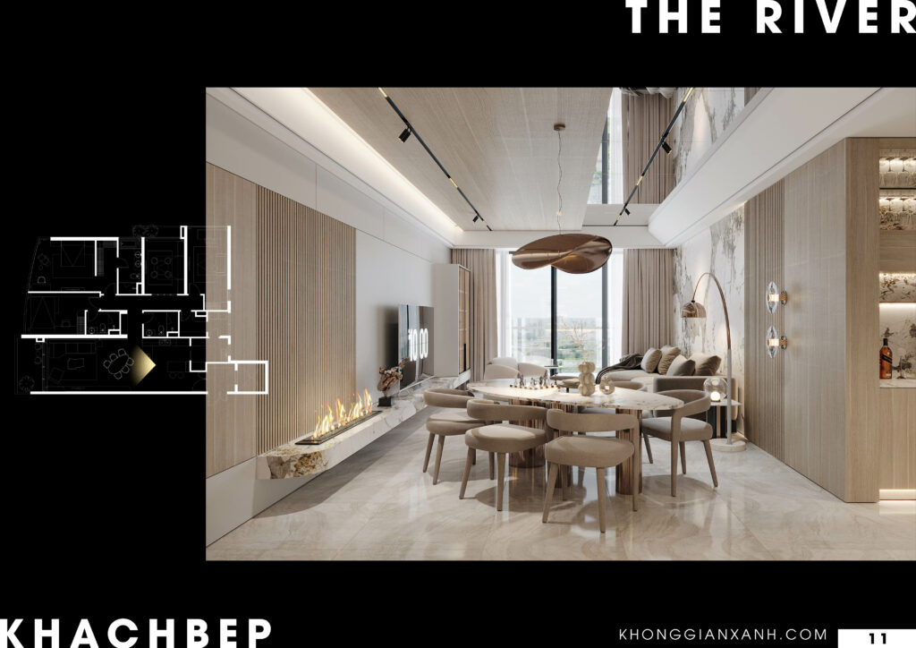 Đáp ứng mong muốn của chủ nhà về không gian nội thất tươi sáng, thuận tự nhiên. Tone màu chủ đạo cho thiết kế nội thất căn hộ The River Thủ Thiêm là sắc gỗ sáng tự nhiên, kết hợp các mảng đá rõ vân. Hình khối kiến trúc chủ yếu là vuông, theo hướng hiện đại, lược bỏ các chi tiết cầu kỳ. Kết hợp các đèn trang trí để cân bằng và làm dịu không gian.