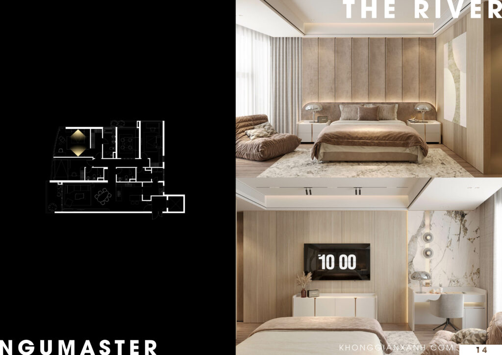 Thống nhất ý tưởng thiết kế, màu sắc và vật liệu với không gian khách bếp, phòng ngủ master sử dụng màu sắc sáng ấm, nhã nhặn. Ánh sáng được bố trí logic và rạch ròi về tính năng chiếu sáng. Các bố cục trang trí chú trọng nhiều đến công năng sử dụng và đảm bảo sự tinh tế gọn gàng.