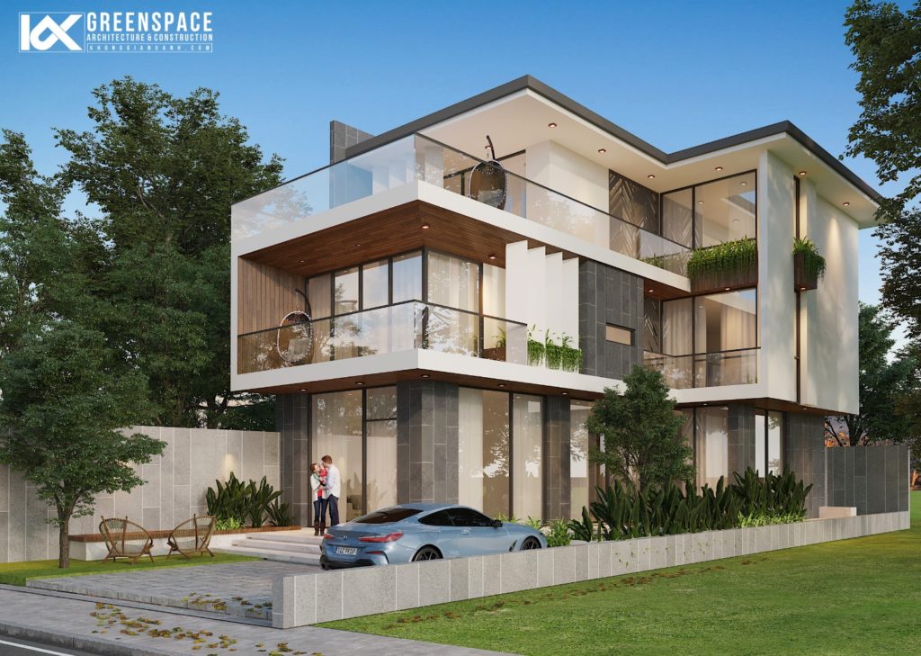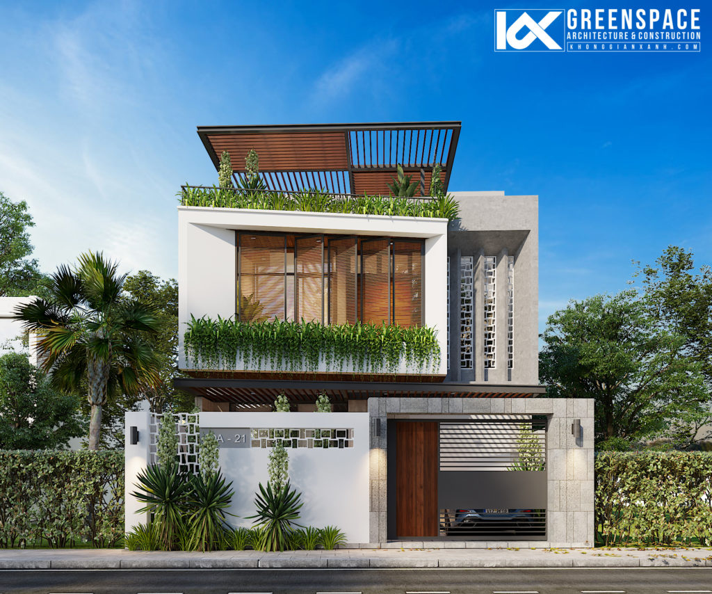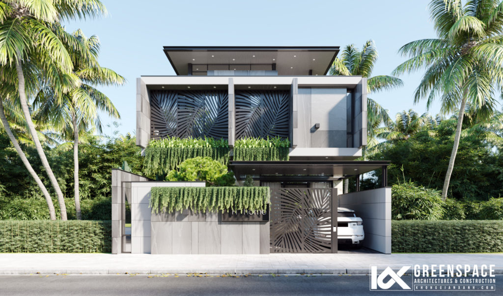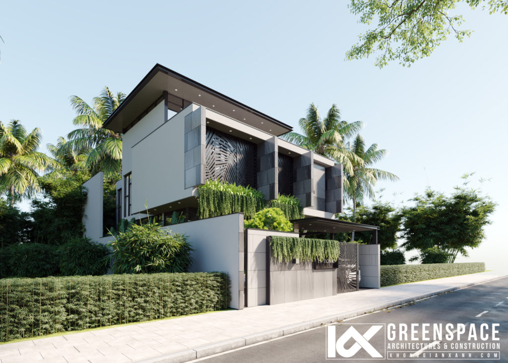 Biệt thự được thiết kế bao phủ bởi hệ thống cây cối, phủ xanh mặt tiền, giảm bớt nắng nóng. Không Gian Xanh kết hợp sắp xếp các hình khối bất đối xứng để tạo kiến trúc độc đáo. Đồng thời giảm tác động của ánh nắng gắt trực tiếp vào nhà.