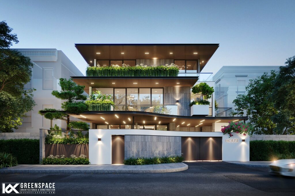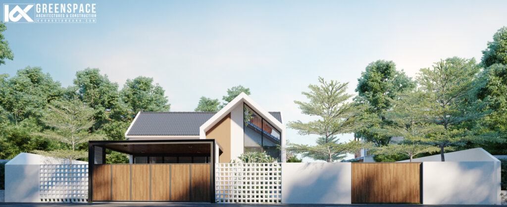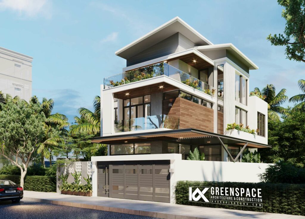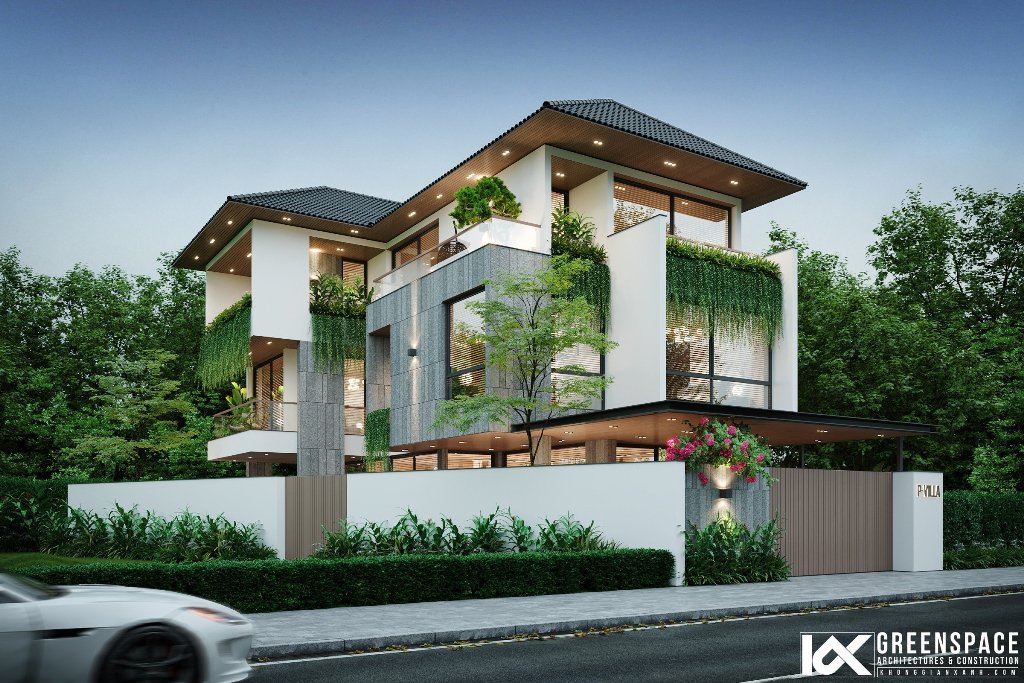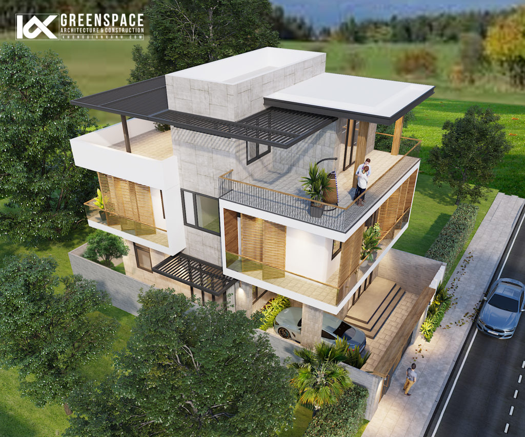 Biệt thự được thiết kế bao phủ bởi hệ thống cây cối, phủ xanh mặt tiền, giảm bớt nắng nóng. Không Gian Xanh kết hợp sắp xếp các hình khối bất đối xứng để tạo kiến trúc độc đáo. Đồng thời giảm tác động của ánh nắng gắt trực tiếp vào nhà.