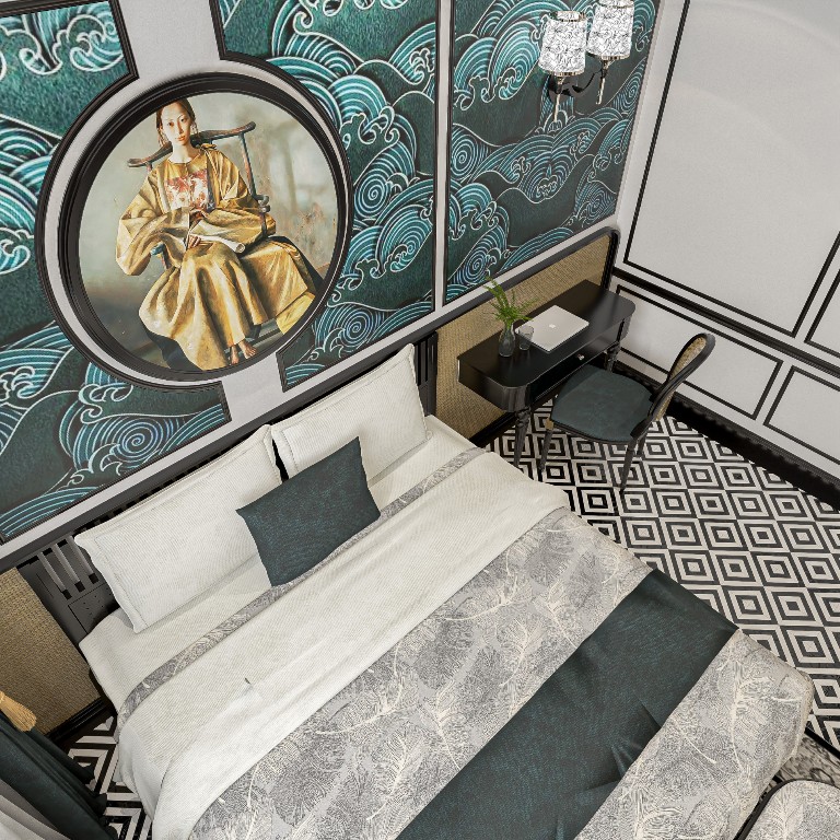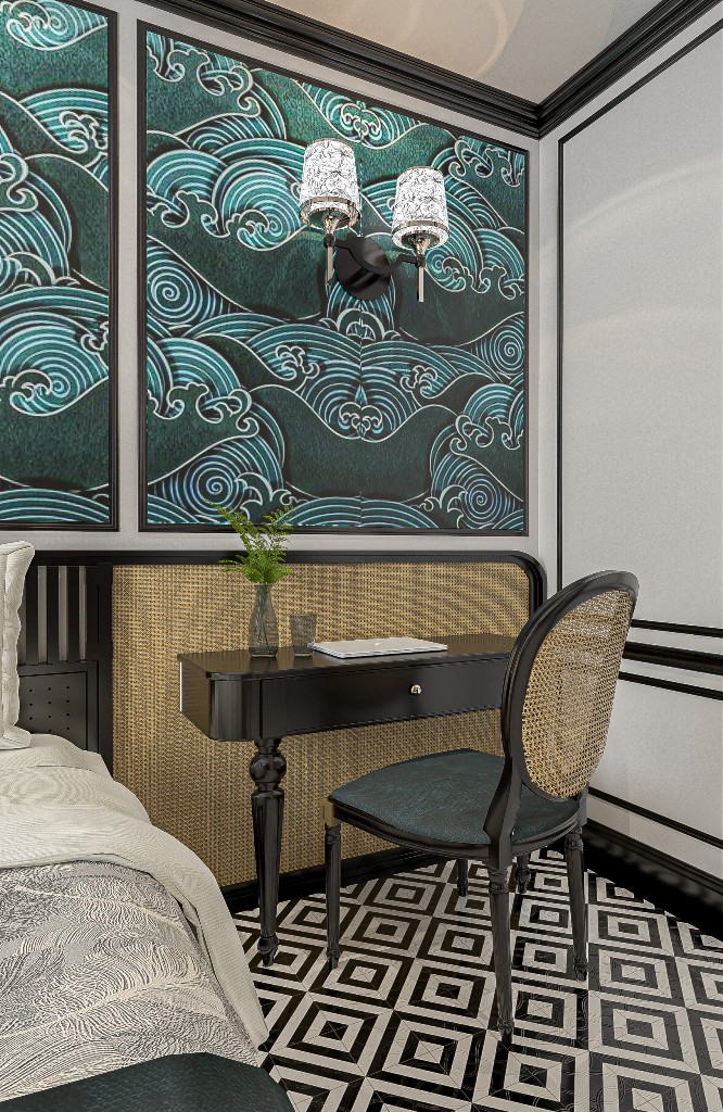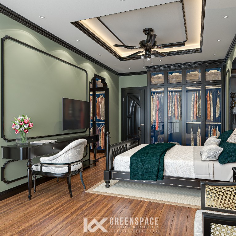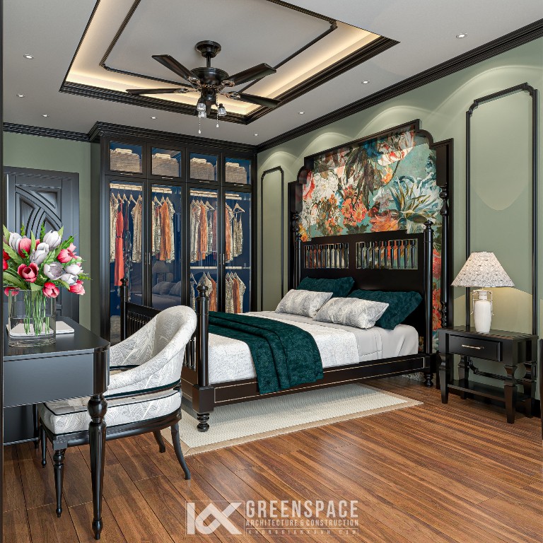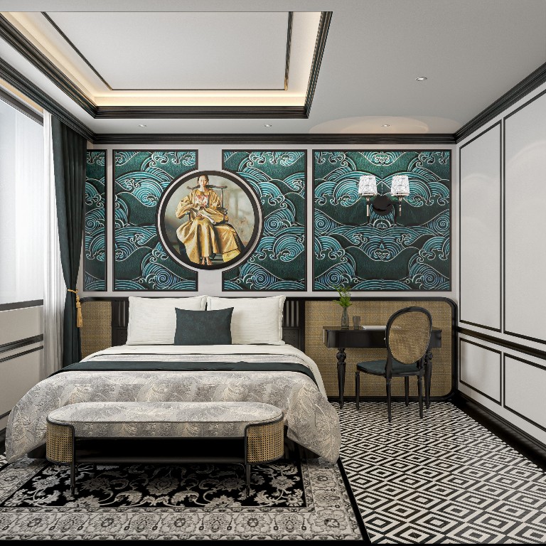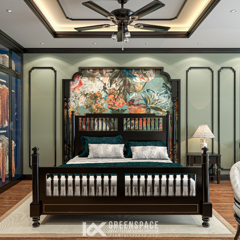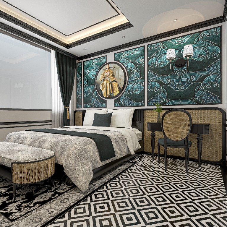 Các họa tiết kỷ hà, hoa lá, tượng phù điêu là những dấu ấn không trộn lẫn của phong cách Indochine. Các vật dụng nội thất như đèn trần, giường, ghế sofa… được sắp xếp hài hòa. Giữ nguyên vẻ đẹp phong cách Đông Dương và đảm bảo tính tiện nghi trong sinh hoạt cho gia chủ.