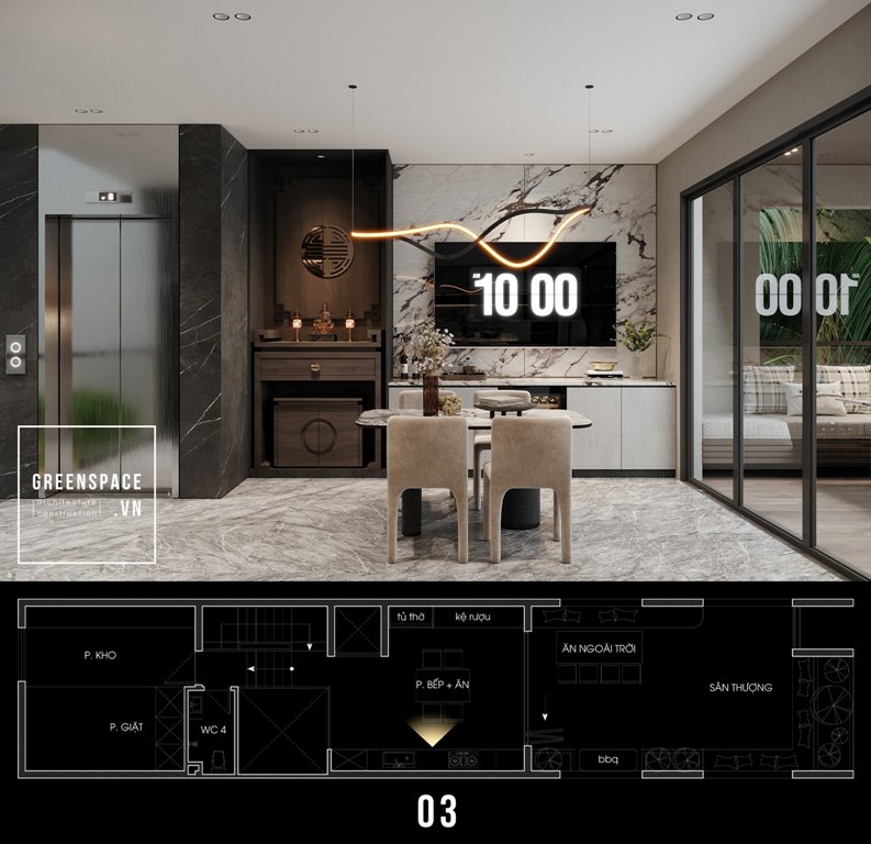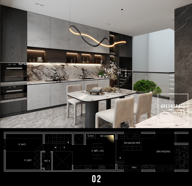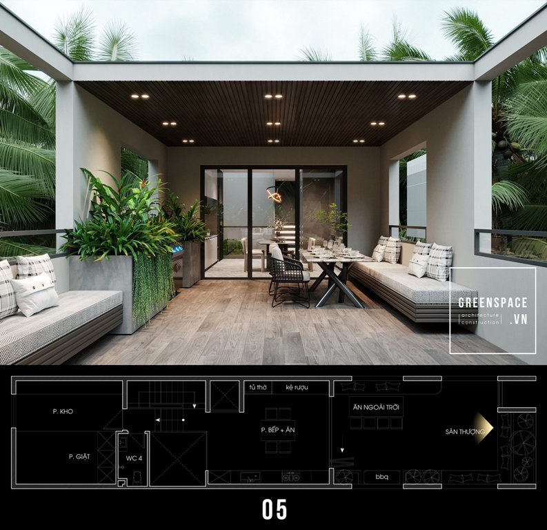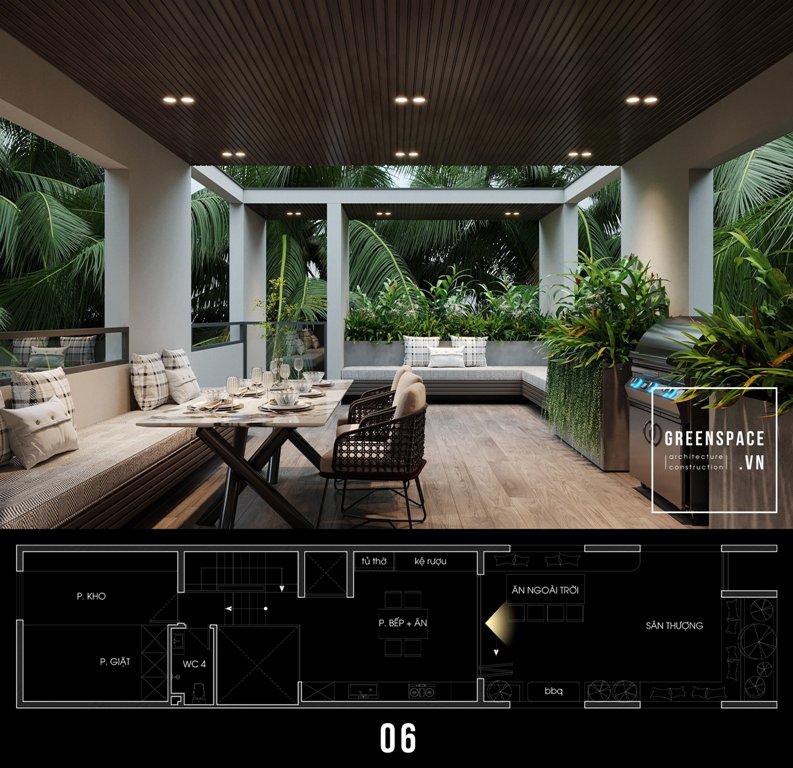 Cụm bếp ăn kết hợp sân thượng sinh hoạt chung với phong cách hiện đại. Thiết kế đáp ứng công năng và các tiện ích tiêu chuẩn. Vật liệu và màu sắc hướng đến sự nhã nhặn, đồng bộ với tổng thể và tối ưu chi phí.